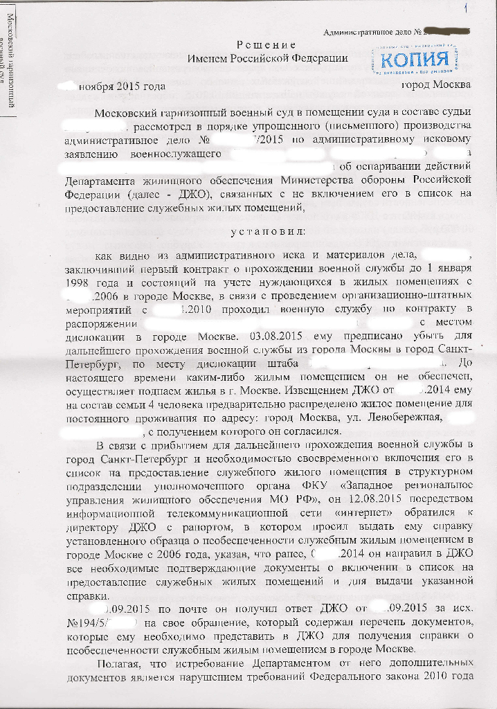 Вчера получил решение суда. Судился с ДЖО по вопросу признания неправомерными требований ДЖО о предоставлении дополнительных документов для получения справки о необеспеченности служебным жильем. Напомню, что для получения такой справки ДЖО требует дополнительно представить Послужной список, копию справки о сдаче служебки по предыдущему месту службы, справку о необеспеченности служебкой от командира части. Причем это требование ДЖО предъявляет вне зависимости того, стоишь ты на учете нуждающихся в служебном жилье или нет.