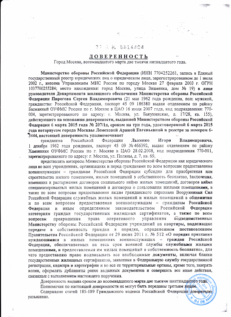 #20451Абсолютно нормальная доверенность, числа,лица,действия -всё указано. Это копия. Ни один нотариус Вам эту копию не заверит.Да и зачем Вам это?Подскажите пожалуйста по поводу доверенности, выданной в ДЖО, как сказала мне сегодня нотариус, она оформлена не правильно и юридической силы не имеет, поскольку нет даты, должности, фамилии и подписи лица выдавшего её. Это очень пугает с учетом предоставления доков в МФЦ. Она её (доверенность) даже заверить отказалась! У вас такая же?Мы тоже вчера получили доки на д.12/5.Сегодня заходил в УК,сказали,что пока по второй очереди нечего не знают.Попросили звонить с понедельника по телефону 495-641-40-73 доб.45-00.