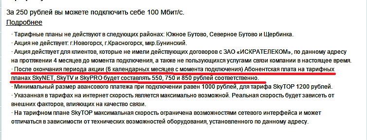 Читайте информацию до конца. "После окончания периода акции (6 календарных месяцев с момента подключения) Абонентская плата на тарифных планах SkyNET, SkyTV и SkyPRO будет составлять 550, 750 и 850 рублей соответственно."QR_BBPOST 100 Мбит за 250 рублей? Супер!