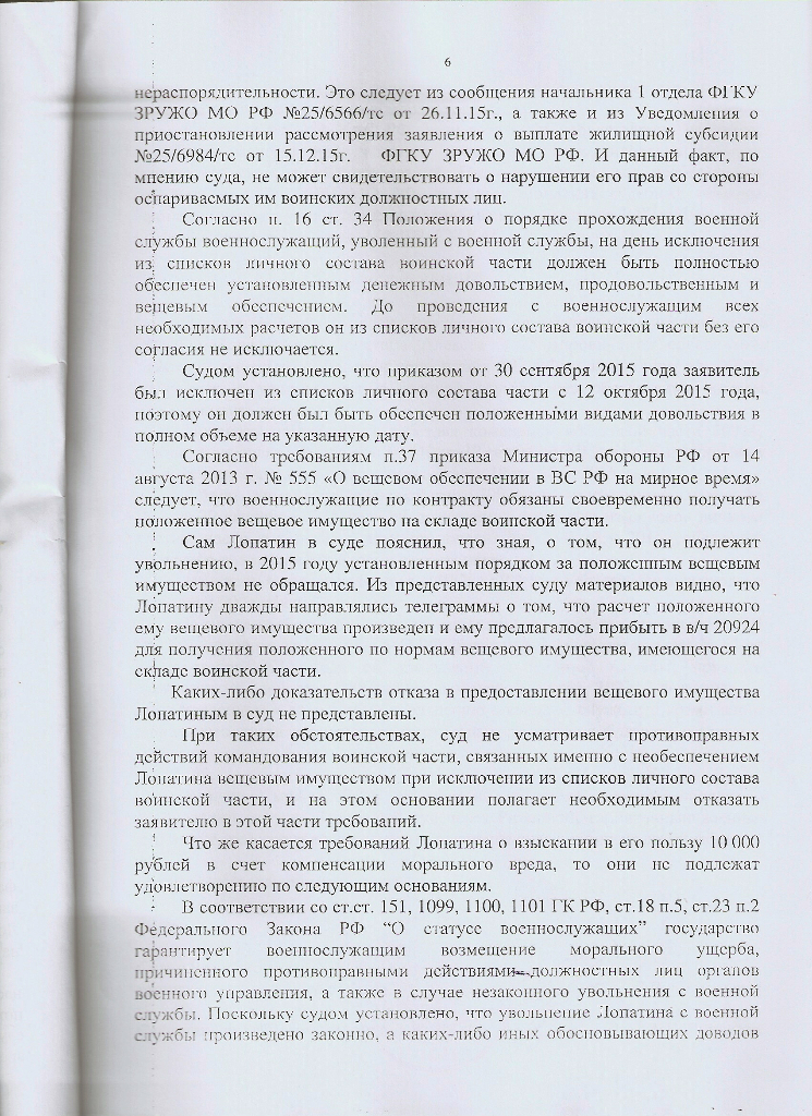 Не менее странный вывод суда о том, (абз. 6 л. 5 решения), что «касается доводов заявителя о не обеспечении его жильем до настоящего времени, то право административного истца на жилое помещение, может быть реализовано им после увольнения с военной службы», просто вызывает недоумение, поскольку сам судья подробно цитируя в (абз. 6 л. 2 решения) положения Конституции РФ, ч. 5 ст. 3 и ст. 15 Федерального закона «О статусе военнослужащего», и п.17 ст. 34 Положения о порядке прохождения военной службы (Указ Президента РФ от 16.09.1999 г. № 1237) указывает на то, что военнослужащий, общая продолжительность военной службы которого составляет 10 лет и более, нуждающийся в улучшении жилищных условий по норма, установленным федеральными законами и иными нормативными правовыми актами Российской Федерации, без его согласия не может быть уволен с военной службы в связи с организационно-штатными мероприятиями без предоставления ему жилого помещения либо субсидии на приобретения или строительства жилого помещения по нормам жилищного законодательства. Он своего согласия на увольнение не выражал!