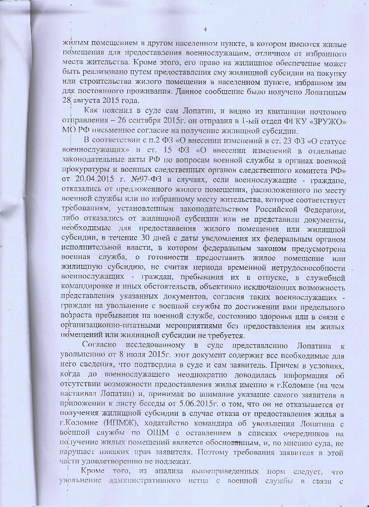 #3067Нет, такого в решении нет, а указано, что Принимая решение об отказе в удовлетворении его требований о признании незаконными приказов о его увольнении с военной службы и исключении из списков личного состава части, судья Охременко исходил из того, (абз. 3 л. 4 решения), что в соответствии с п. 2 ст. 23 Федерального закона «О статусе военнослужащих» и ст.15 ФЗ «О внесении изменений в отдельные законодательные акты РФ от 20.04.2015 г. № 97-ФЗ, его согласие на увольнение до обеспечения жилым помещением или жилищной субсидии не требуется в ввиду того, что он не представил документы, необходимые для предоставления жилого помещения или жилищной субсидии, в течении 30 дней с даты уведомления их федеральным органом исполнительной власти. Однако с такими выводами суда согласиться нельзя.QR_BBPOST Все очень просто. Его уволили на основании того, что он отказал от уведомлений на жилье. Ведь уволить могут не только при отказе от субсидии, но и отказе от жилья.