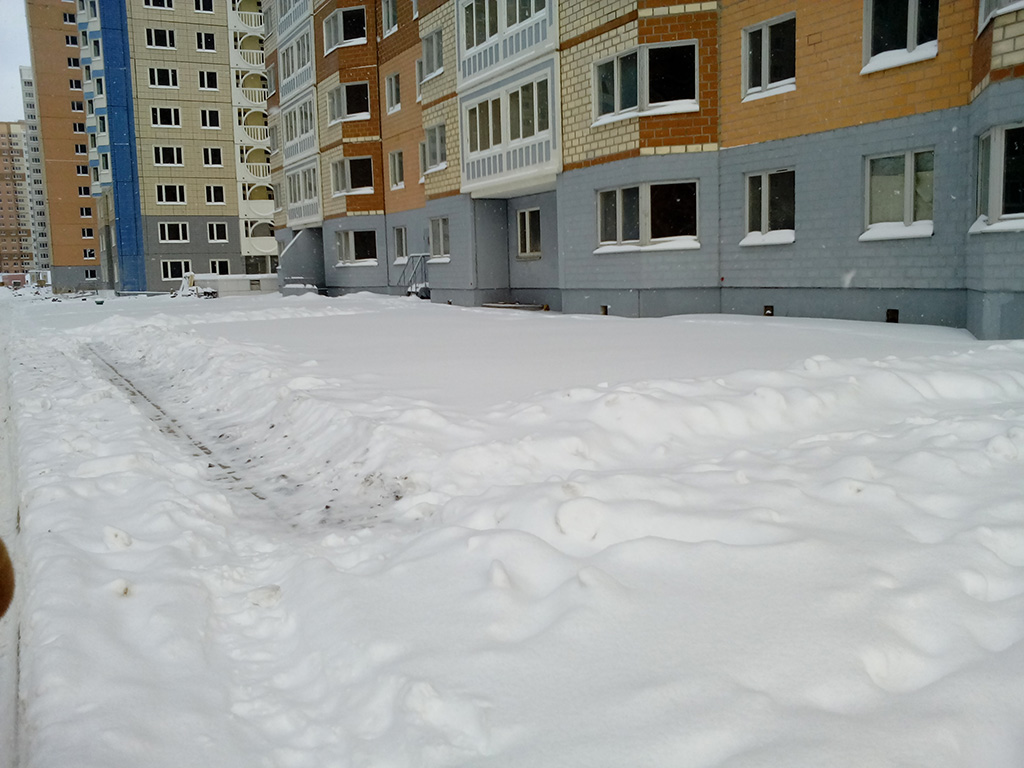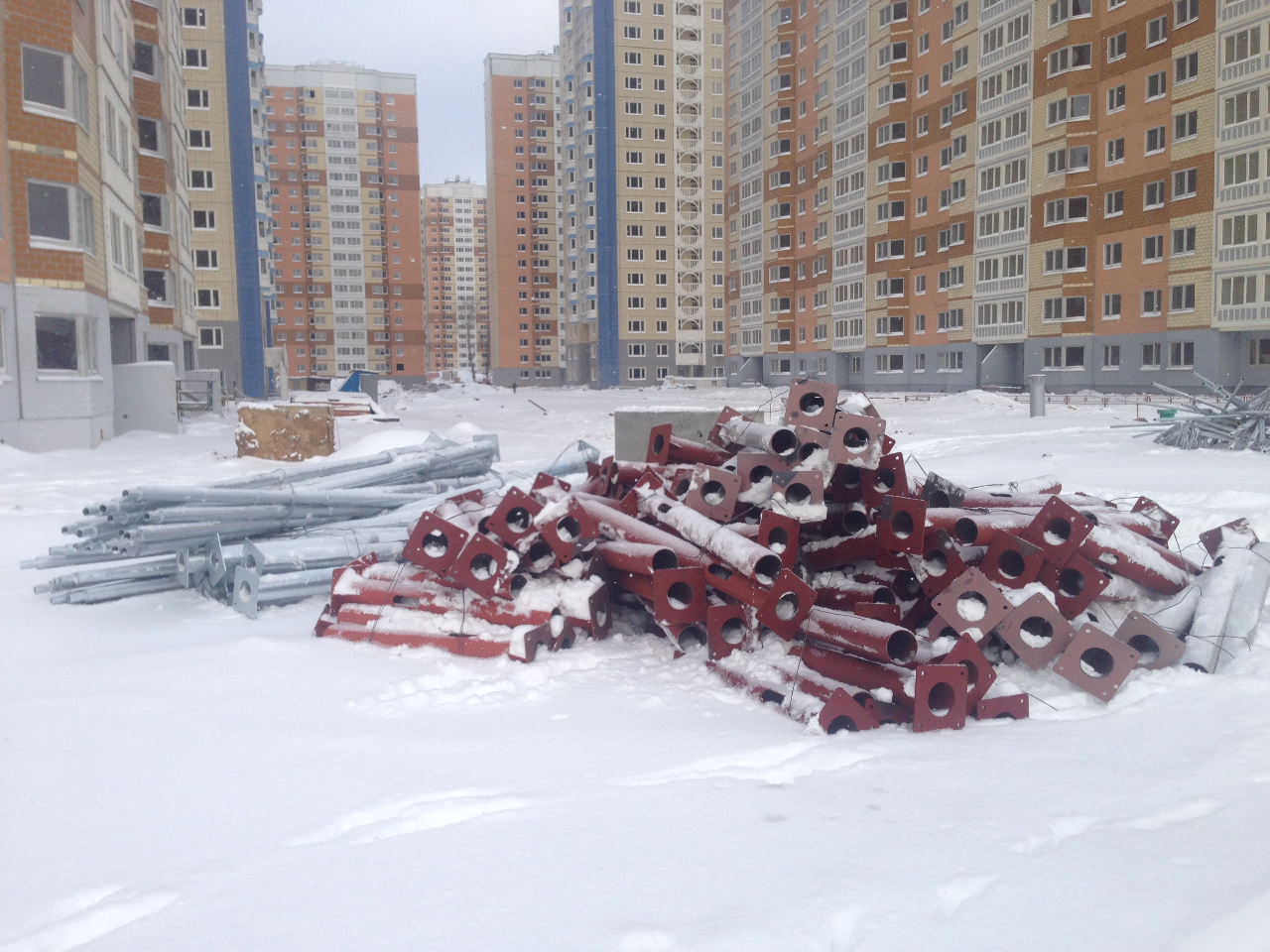 На территории, в нескольких местах, ведутся работы по ливневой канализации, дворы 2, 5, 6, 7, 8 корпусов. Столбы освещения сейчас не устанавливают, земля замерзла. В самих корпусах тоже работ нет.