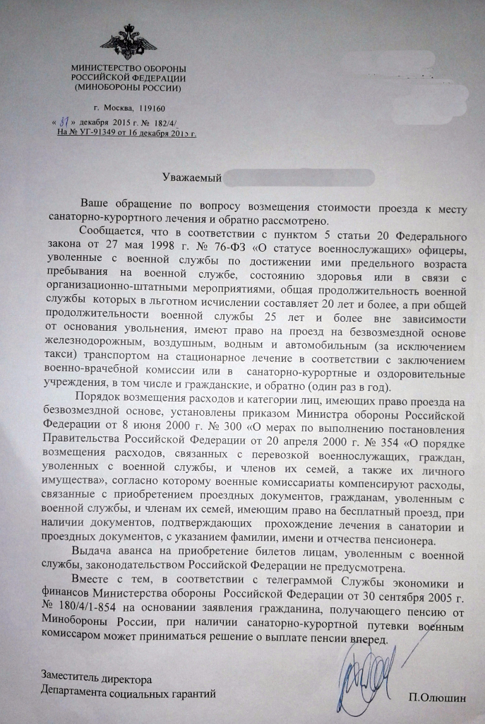 #1621Да это скорее всего "законотворчество" ВК и вышестоящих финансовых органов МО. В связи с урезанием бюджета страны наверное не стоит сейчас испытывать судьбу и ездить в курортные учреждения на территории СНГ, что бы потом не бегать по судам и выбивать свои деньги за проезд ( моё мнение)