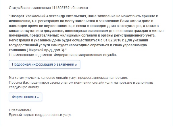 #4914Сегодня пришел ответ с сайта госуслуги.ру на наше заявление о прописке в 15 дом.