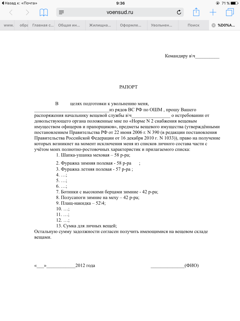 #13778Всё нормально, получил субсидию, осталось отгулять отпуска. Подскажите пожалуйста, где взять все формы рапортов при увольнении, на "президентский" отпуск, на расчёт за вещевую и т.д. Выслуга 24 календарных 30 лет льготных. Вообще, если можно распишите по тезисам, что и какие рапорта писать? От армии больше ничего не хочу) от ВВК отказался.