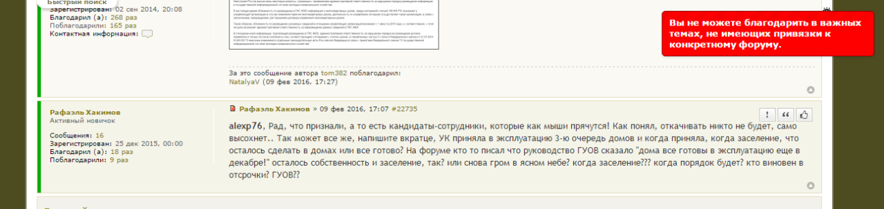#22728[ref]alexp76[/ref], Рад, что признали, а то есть кандидаты-сотрудники, которые как мыши прячутся! Как понял, откачивать никто не будет, само высохнет.. Так может все же, напишите вкратце, УК приняла в эксплуатацию 3-ю очередь домов и когда приняла, когда заселение, что осталось сделать в домах или все готово? На форуме кто то писал что руководство ГУОВ сказало "дома все готовы в эксплуатацию еще в декабре!" осталось собственность и заселение, так? или снова гром в ясном небе? когда заселение??? когда порядок будет? кто виновен в отсрочки? ГУОВ??