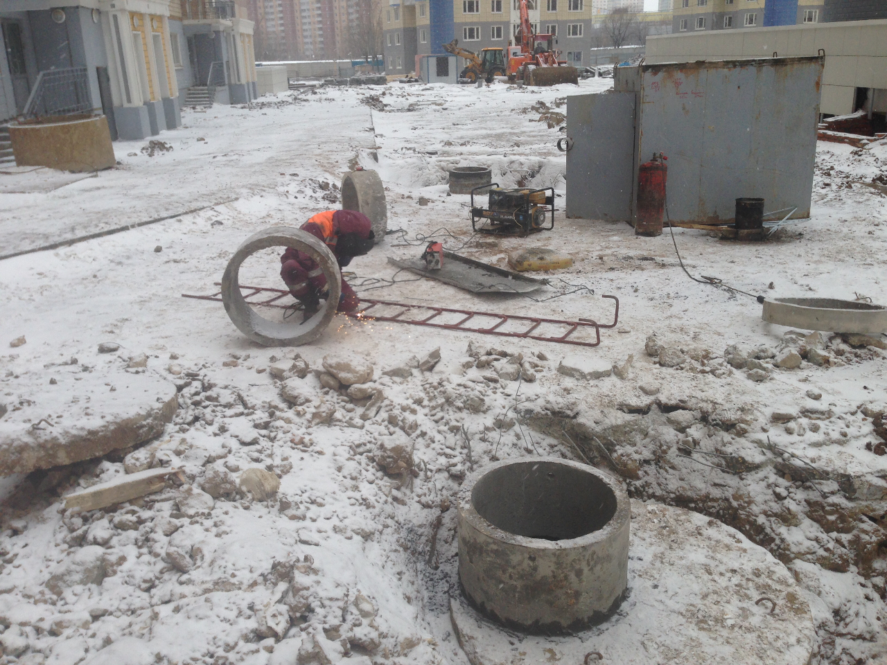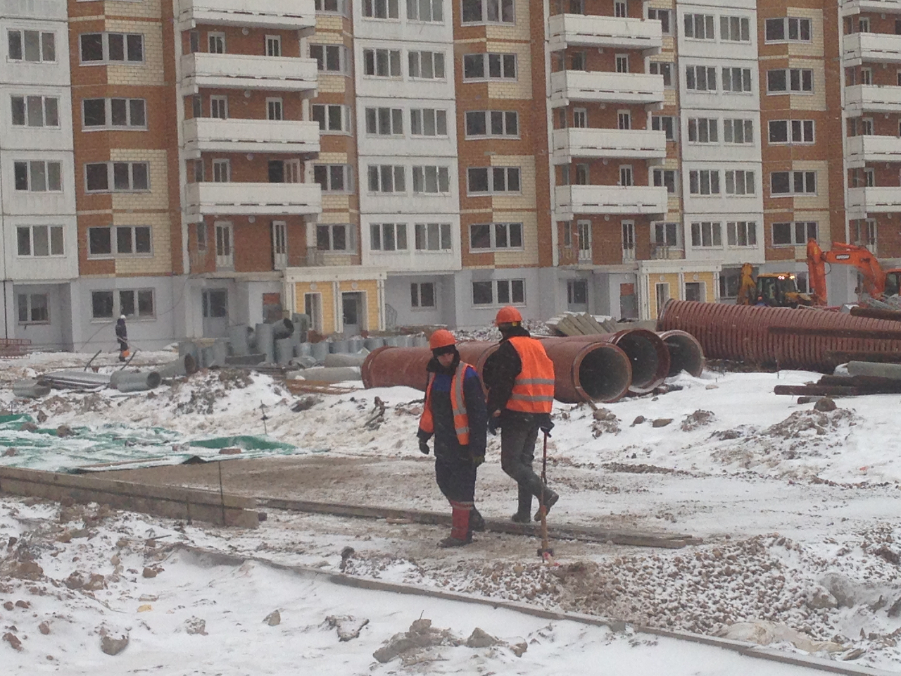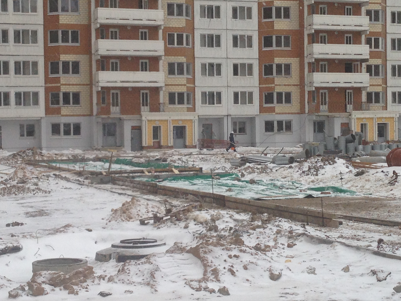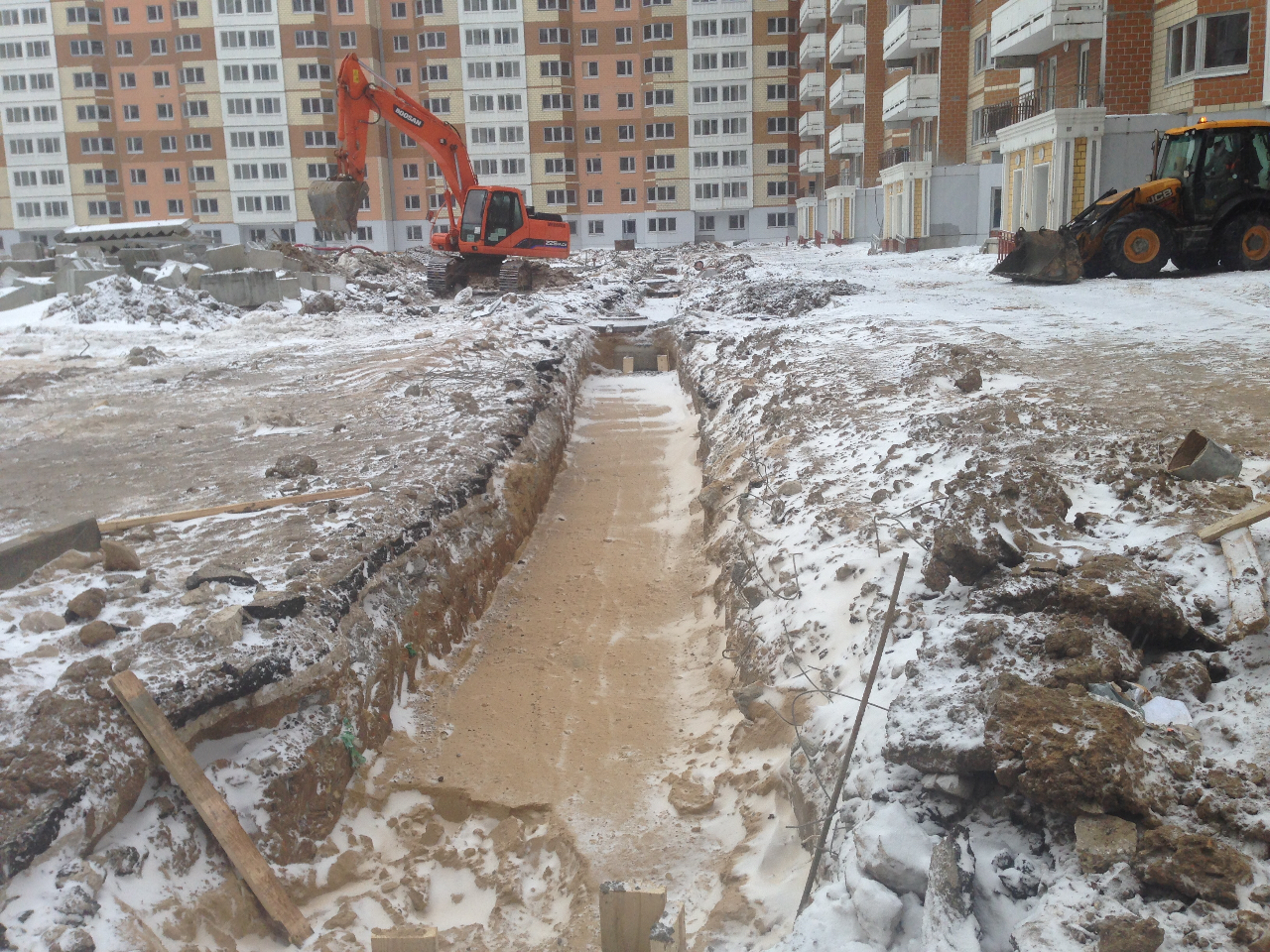 У 12 корпуса часть ливневки проложена и закопана, некоторая ещё в работе. Также проложен новый дренажный придорожный участок.