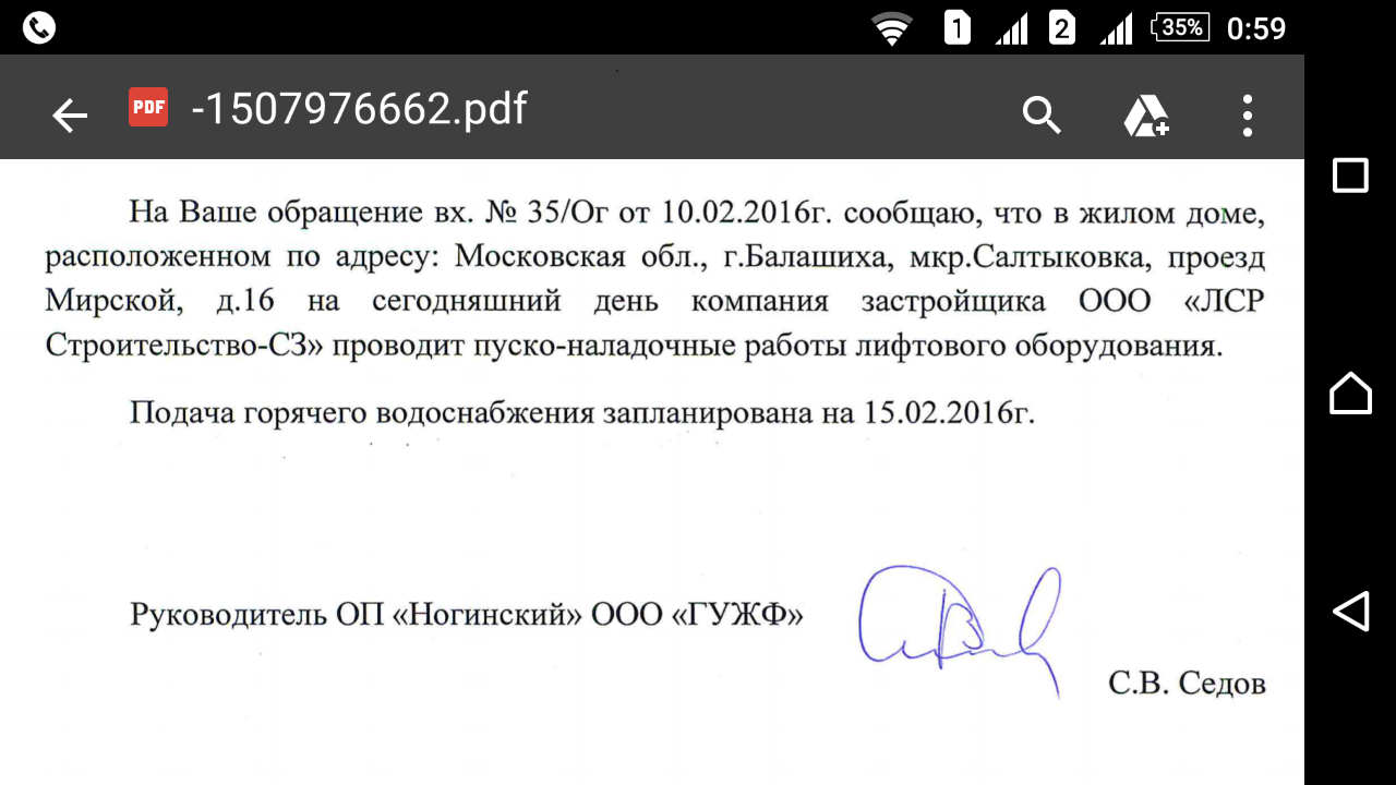 Всем доброго вечера. Сегодня был у Седова Сергея Владимировича по вопросу представления хоть какой нибудь бамажки или ксерокопии переписки о том что лифты в доме 16 не работают, на что он мне ответил что справок не дает и внутреннюю переписку тоже не даст отксерокопировать, на вопрос что мне делать как мне заселиться на 17 этаж, он сказал что готов меня заселить без проблем и с неисправными лифтами. Так же отправил меня к застройщику наших домов, они я так понял остались крайние. По гарантийным обязательствам перед УК ГУ ЖФ, у которых истек срок, они обязаны были провести испытания и запустить лифты. Сам застройщик находятся в Санкт-Петербурге, мне дали его телефоны. Теперь нужно звонить им и у них требовать для РУЖО справку о том что лифты не работают.