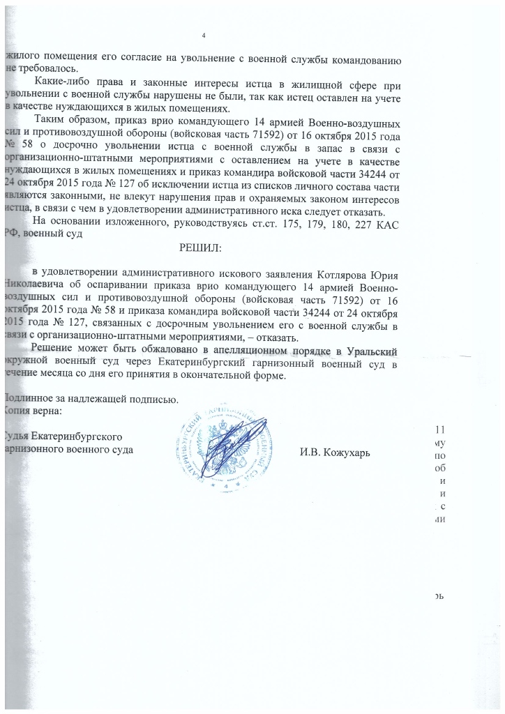 Доброго времени суток. Выкладываю решение гарнизонного суда. Понимаю, что на Урале нет шансов выиграть, но обжаловать собираюсь. Если у кого есть мысли которые можно применить в апелляционной жалобе и не жалко ими поделиться- то буду за содействие признателен.
