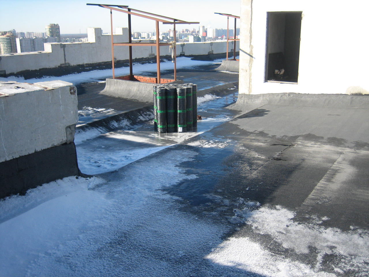 QR_BBPOST Ледорубом разбивают лед, крупные осколки сбрасывают с крыши, затем газом растапливают, поверхностно сушат крышу и затем кладут рубероид.