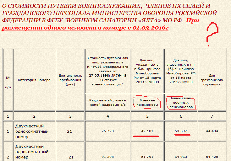 п/п Категория номера Длительность пребывания (дни) Стоимость путевки для лиц, указанных в п.4ст.16 Федерального закона от 8.11.2011г. №309-ФЗ Для лиц, указанных в п.б,в, Приказа Минобороны РФ от 15 марта 2011г. №333 Для лиц, указанных в п.г (б),д, Приказа Минобороны РФ от 15 марта 2011г. №333 Для гражданских служащих