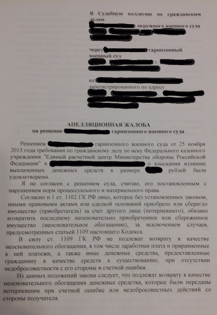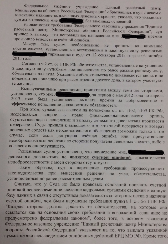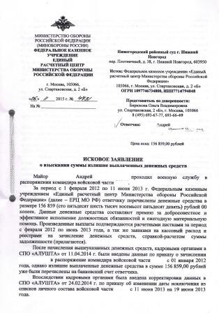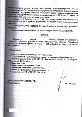 #2653Добрый день уважаемые форумчане, вот и меня пытается настигнуть гидра под названием ЕРЦ, суд уже 29.02.16(так получилось, что требования забрал только сегодня). Выкладываю исковое в суд против меня о взыскании суммы излишне выплаченных денежных ср-в. Просьба подскажите как отбиваться в суде, особенно от фата недобросовестности с моей стороны(типа должен знать законы согласно устава и т.п.),что приводить в свою защиту кроме ст.1109 п.3, тем более как они заявляют, что я типа не гражданин, а в/сл и ко мне должны применяться только нормы Фед. Законов. Есть у кого нибудь какие либо мысли по этому поводу?