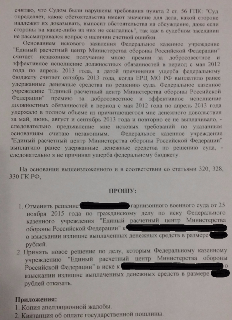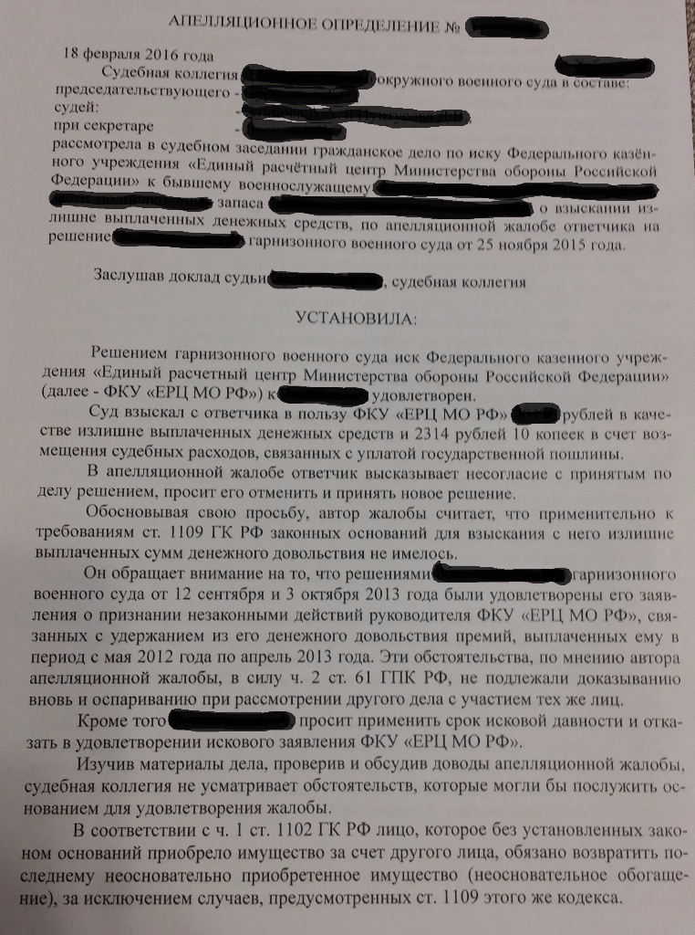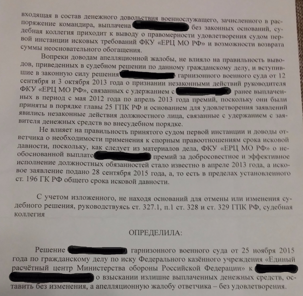 QR_BBPOST Выплатили премию - забрали премию из ДД. Воин в суд. Суд признал незаконными действия ЕРЦ по изъятию денежков без суда. Обязал ЕРЦ выплатить денежку. Прошло время и ЕРЦ подает в гражданский суд заяву о том, что дескать ЕРЦ премия была безосновательно выплачена так как воин на неё права не имел. При этом дату причинения ущерба считает не дату выплаты премии, а дату исполнения решения суда - т.е. когда ЕРЦ вернула незаконно отнятую денежку. В первом суде мы выиграли. В апелляции давил на то, что выплаченная ЕРЦ денежка по решению суда никакой премией уже не является, и не имеет к ней никакого отношения, так как ЕРЦ просто исполнило решение суда. Если ЕРЦ не согласно с решение суда - пускай обжалует в установленном порядке (правда сроки давно прошли).В апелляции решение устояло. На суды вообще не ходили. Определение апелляции пока не получали. Как товарищ его заберет - выложу.