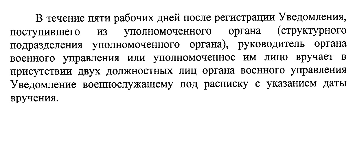 вот так: "...В течение пяти рабочих дней после регистрации Уведомления, поступившего из уполномоченного органа (структурного подразделения уполномоченного органа), руководитель органа военного управления или уполномоченное им лицо вручает в присутствии двух должностных лиц органа военного управления Уведомление военнослужащему под расписку с указанием даты вручения...."???