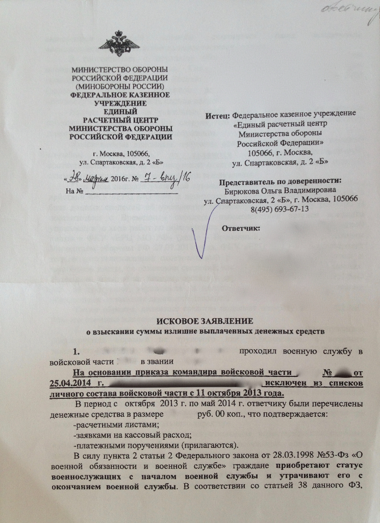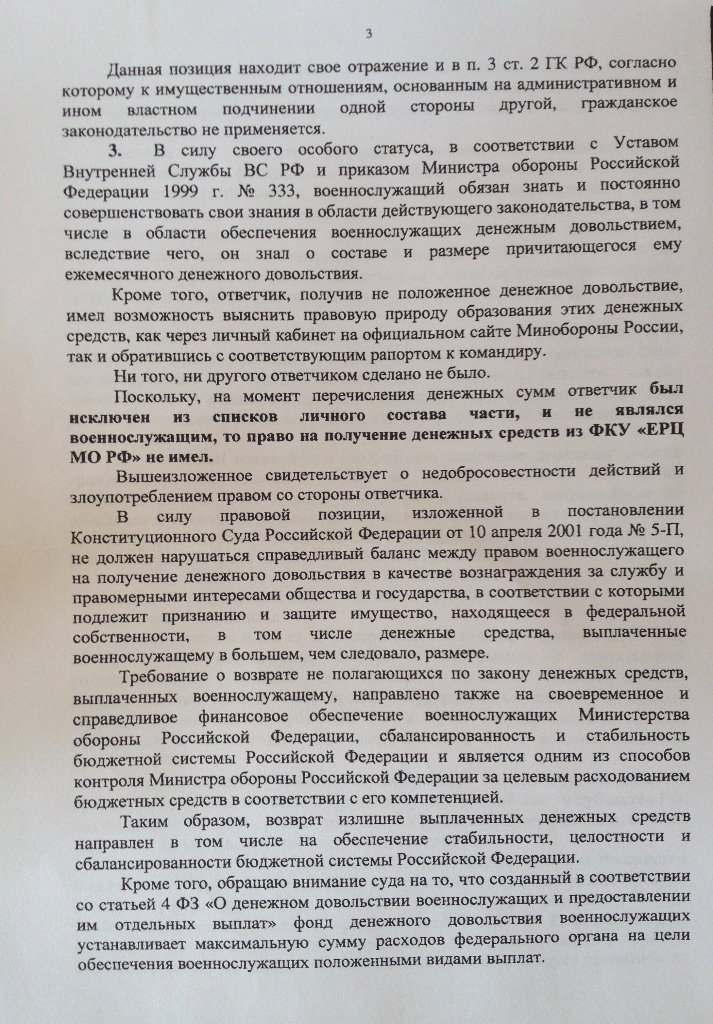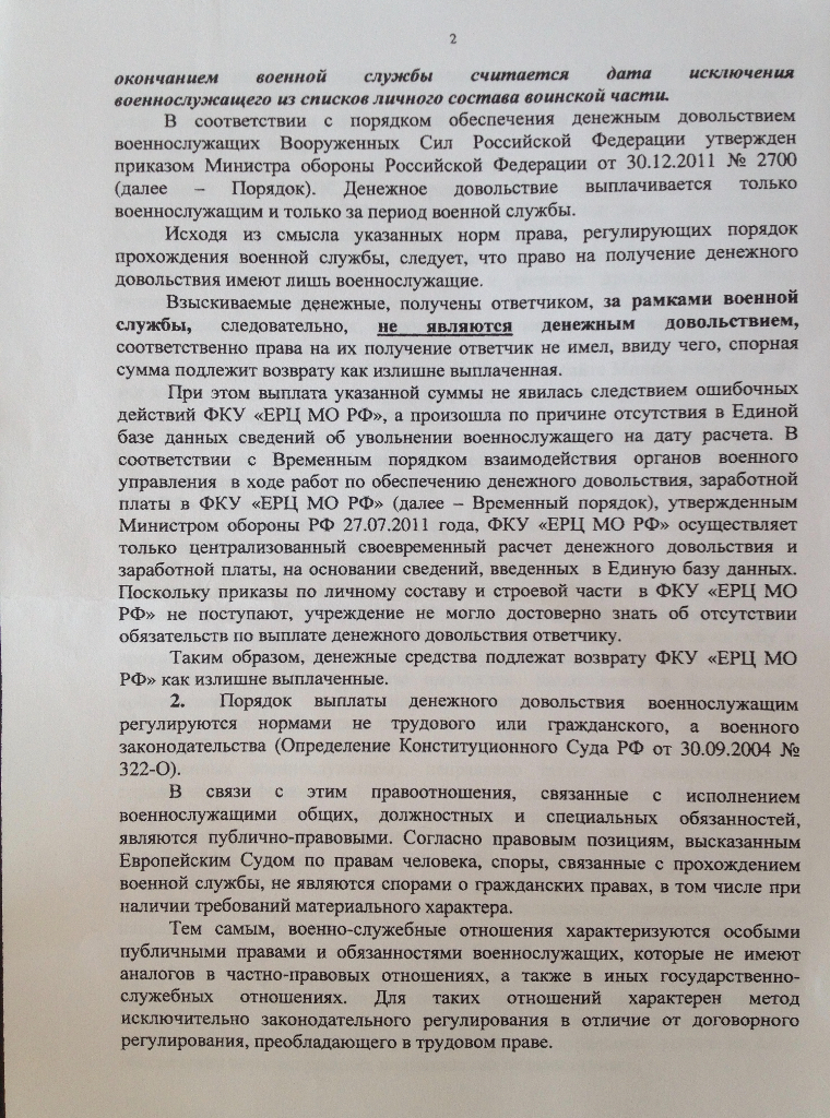 Так Бирюкова сама ссылается на то, что это было денежное довольствие. Только по её мнению, если ДД выплачено уже уволенному воину, то это уже не ДД. Пускай тогда расчетные листки переписывает и указывает назначение платежей за ноябрь, декабрь и т.д.QR_BBPOST Значит делайте упор на то, что указанные денежные средства были выплачены в качестве ДД, а не в качестве каких-либо иных сумм, а значит на них полностью распространяются положения п.3 ст.1109 ГК.