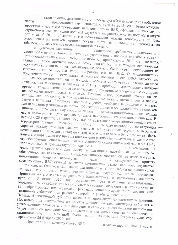 приветствую форумчан, прошу помощи и совета: в прошлом году сообщал о выплате субсидии не на всех членов семьи(на учете стояло пятеро, но внебрачного ребенка пытались кинуть, суд выйграл, в апелляции решение устояло, суд обязал отменить решение о выплате на четверых, внести изменение в решение с учетом сына и выплатить, 2 отделу отменить решение о снятии с учета нуждающихся, восстановить в списках нуждающихся на получения жилья. Решение суда от 15 июня), 15 мая исключили из списков в/ч (уволен был в 2006, находился в распоряжении до обеспечения жильем), субсидия на момент исключения получена на четверых, подал в суд с просьбой отменить приказ на исключение до обеспечения субсидией на всех членов семьи, суд проиграл, апелляция не помогла теперь кассация. Для составления апелляции обращался к адвокату но видимо аргументов было не достаточно, в настоящее время жду перечисления остальной части субсидии, жильем не обеспечен получаю пенсию, снимаю квартиру(пытаюсь у военкомата получить за поднаем), избранное место жительства С-Петербург, теперь решил просить помощи у форума, скан решения дальше