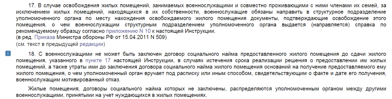 Бред старый. Только ранее он касался только выбравших способ обеспечения натуральным жильем. Они от безнаказанности применяют "кастрированный" пункт 18 Инструкции.....Смотри раздел Справки,Справки,Справки...