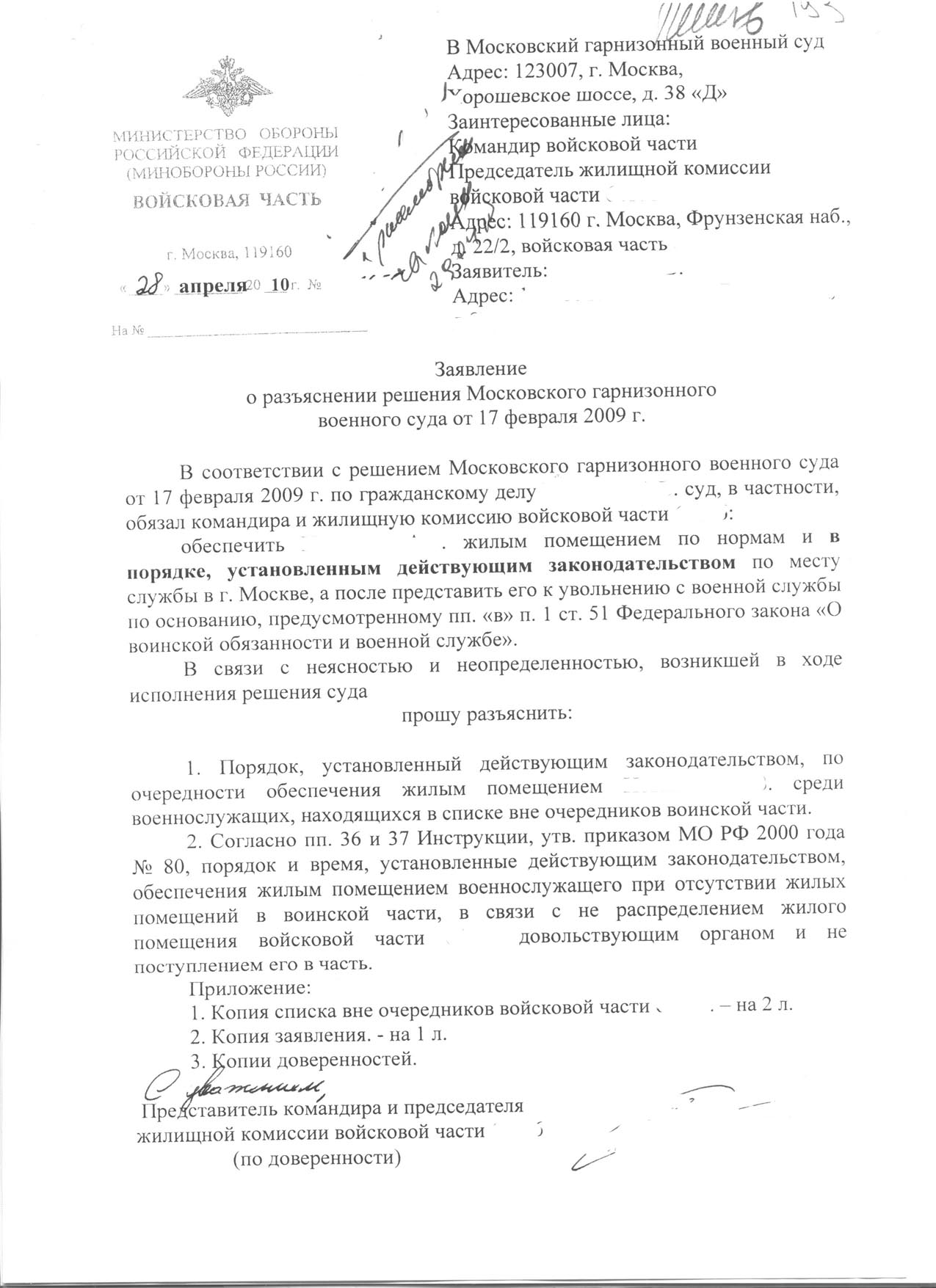 У меня вот интересная ситуация складывается по исполнению моего решения суда. В 2008 году, еще будучи ограниченно годным подал в суд на командующего по жилью. Суд проиграл- типа командующий ненадлежащий ответчик для меня. В 2009 г. выиграл суд по внеочередному жилью у командира части и ЖБК части. ИП возбуждено. Пристав не суетиться. 27 февраля типа распределило ЖБК части квартиру, хотя дословно в протоколе ЖБК написано: ходатайствовать перед ЖБК округа о распределении на меня кв. № 362. Получается окончательное решение по распределению квартиры все равно остается за округом . И ДСН будет командующий заключать, а не КЧ. У меня тут начинаются разборки с округом по жилью сразу в собственность и в свете этого хотелось бы спросить. Мне теперь надо обращаться в суд за разьяснением решения суда по внеочередному обеспечению жильем(КЧ вроде как решение суда выполнил- походатайствовал о распределении мне квартиры), теперь с округом проблемы, они 100% сразу в собственность по хорошему не дадут. Все возвращается на круги своя- опять судиться с командующим и через суд обязать его после регистрации права оперативного управления домом заключить со мной договор передачи квартиры бесплатно в собственность?? Подскажите у кого какие мысли?