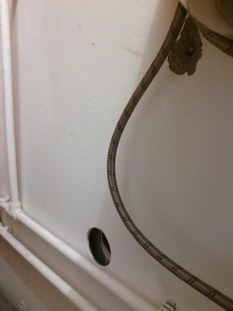 Кроме того, раковина в ванной установлена так, что гусак крана находится ниже её края: Отверстия в местах прохода труб не заделаны - их сложно заделать: Эти отверстия являются дополнительным источником асбестсодержащей пыли.