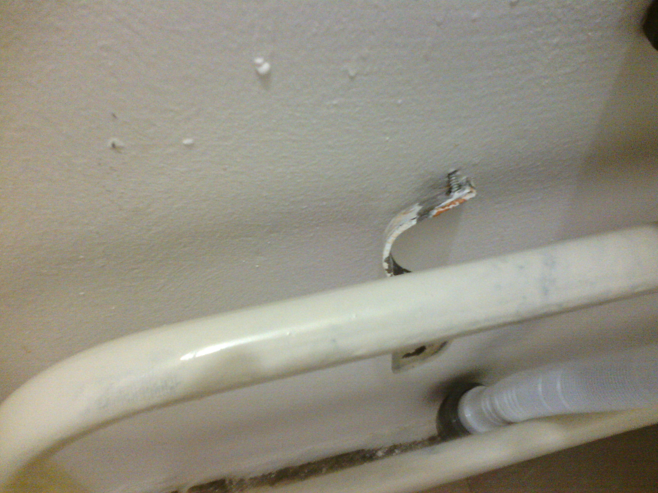Закрепить что-либо надёжно на такой пустотелой перегородке из двух шиферных листов невозможно. Крепёж держится некоторое время, а потом вываливается. Вот как крепят полотенцесушитель: Т.е. закрепить на такой "стене" полочки, зеркало, крючки для полотенец/одежды - это проблема. Даже если получилось, при малейшем приложении усилия всё вывалится.