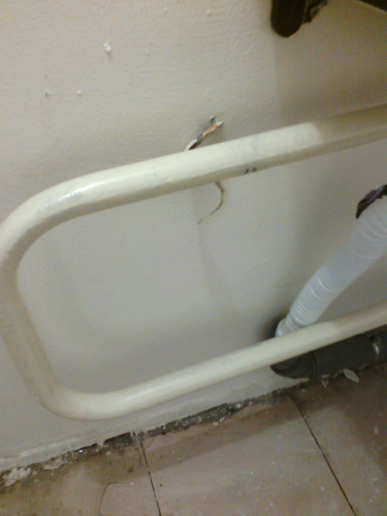 Закрепить что-либо надёжно на такой пустотелой перегородке из двух шиферных листов невозможно. Крепёж держится некоторое время, а потом вываливается. Вот как крепят полотенцесушитель: