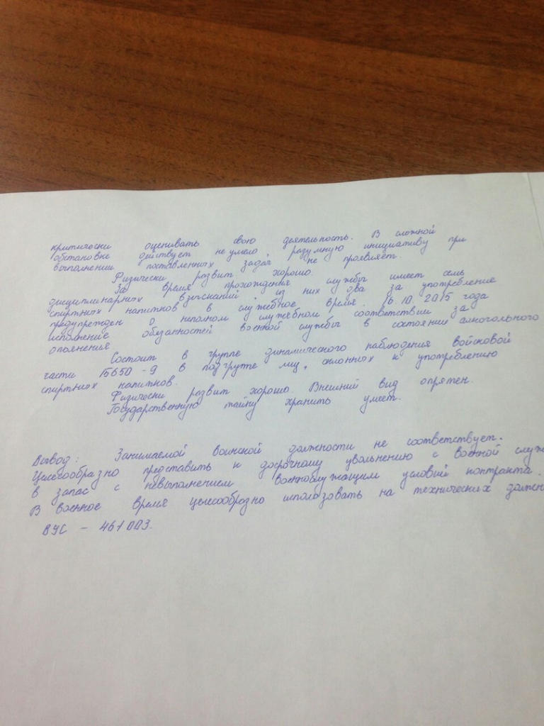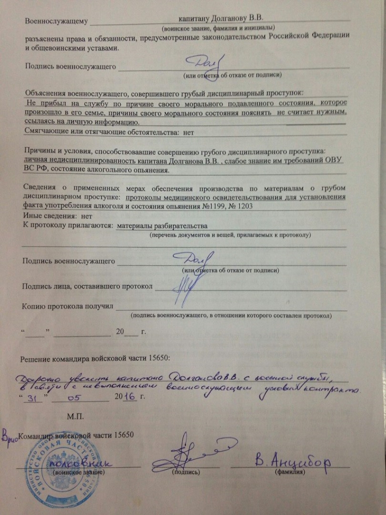 #1119Это залет воин (9 рота). Конечно плохо. Но если упасть на колени и просить прощения возможно решение вопроса полюбовно, так всегда лучше. Так как начать войну тупиковый вариант, потом только переводиться, будете врагом №1 для командира. В этом протоколе меня смущает что разбирательство проводит равный по званию (правомочен ли), решение пишет командир "уволить" (имеет ли право?). Учите законы и уставы, в процедуре наложения взыскания, аттестации, увольнении возможны нарушения со стороны начальства. Но, повторю, этот путь решения вопроса через войну опасен и результат может быть отрицательным. Лучше по любви. Просите снисхождения.QR_BBPOST вот такой залёт..