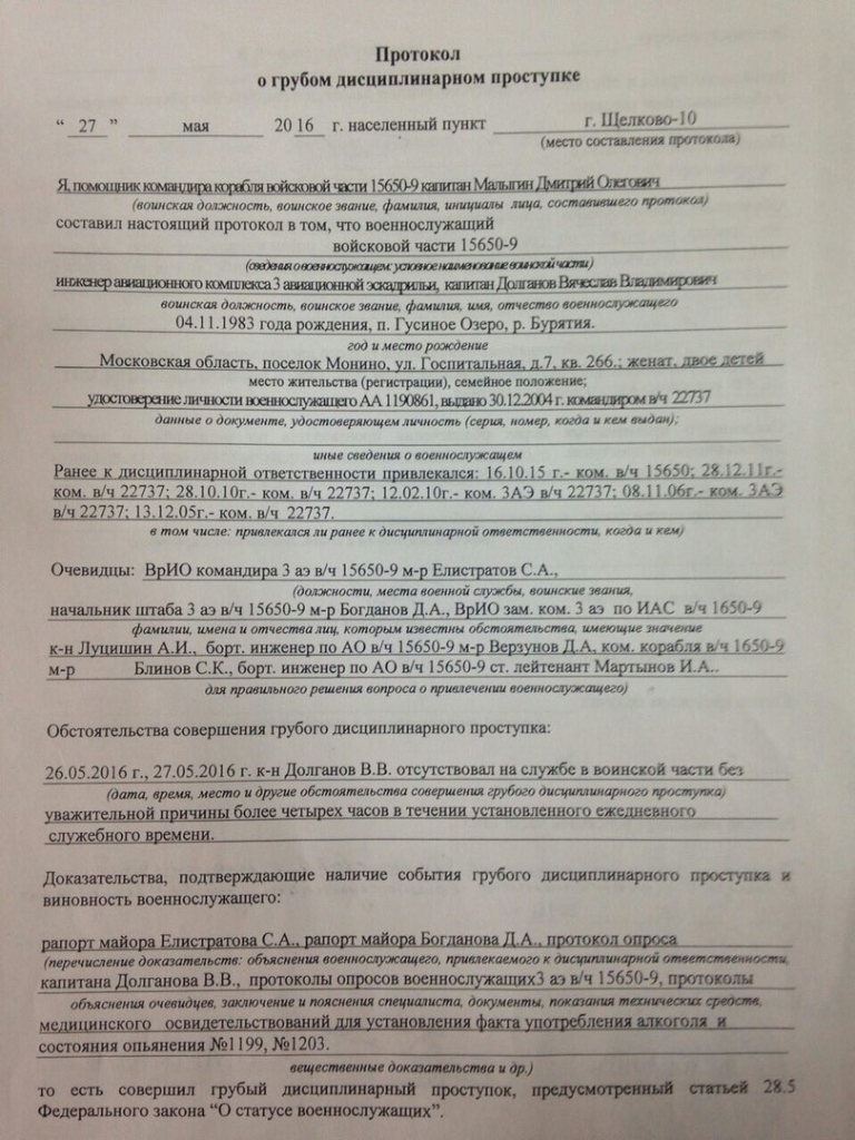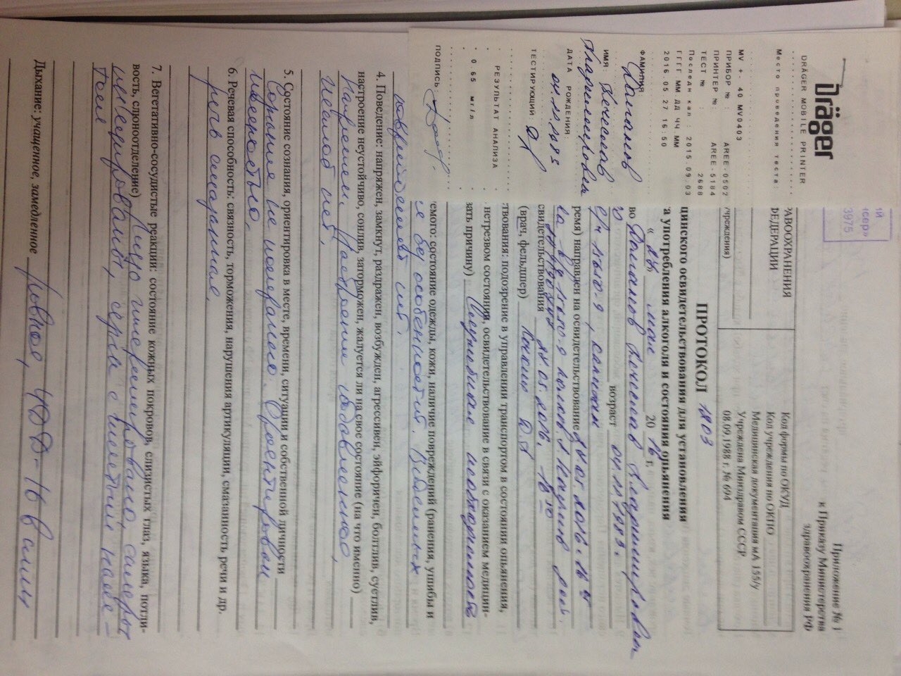 #11374) военнослужащего или гражданина, призванного на военные сборы, в целях выявления состояния опьянения - на основании протокола о применении мер обеспечения производства по материалам о дисциплинарном проступке, составленного в соответствии с требованиями приложения N 6 к дисциплинарному уставу Вооруженных Сил Российской Федерации должностным лицом воинской части, гарнизона или органа военной полиции. Такого протокола нет. Просто ездили на личном авто с начальником на мед. освидет. В деле этого протокола тоже нет. Это информация из МИНИСТЕРСТВО ЗДРАВООХРАНЕНИЯ РОССИЙСКОЙ ФЕДЕРАЦИИ