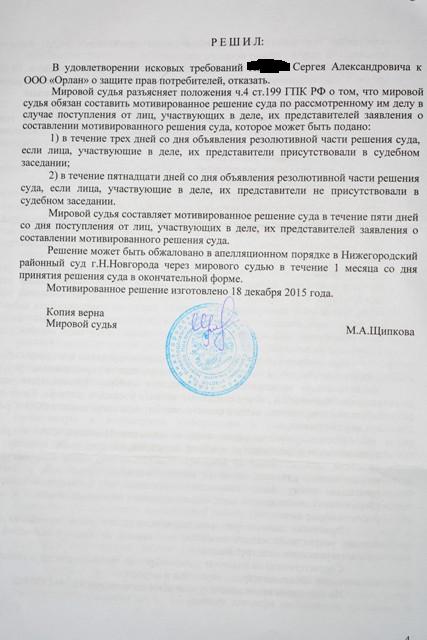 - получение решения суда;