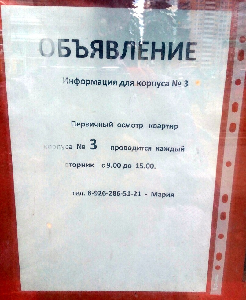 #27048Я весной приезжал. В 3 корпусе в моей квартире вообще входная дверь, снятая с петель на полу лежала перед входом!А как не быть на распашку, там все двери рассохлись, захочешь не закроешь..По осмотру 3 корпуса - особый порядок!