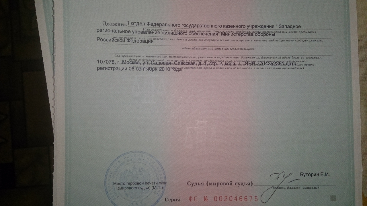 #9295Ну да если гражданский суд, то да откуда у них такие данные. Помниться где-то лежал у меня не реализованный исполнительный лист к 1-му отделу РУЖО МО РФ. Опять Вас выручать приходится, боюсь одной бутылкой Виски не отделаетесь. Держите.QR_BBPOST Но в суде для выдачи исполнительного листа просят данные по ответчику юридическому лицу, кот указываются в листе.