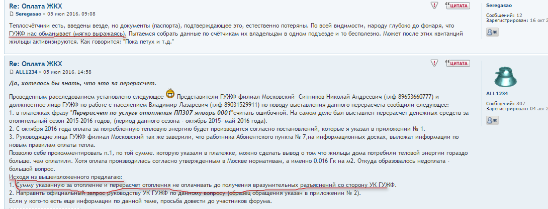 #27746Мое сообщение является фактом воровства Московского ОП ГУЖФ? Я призываю не платить до тех пор пока не получим вразумительного ответа по какому алгоритму производился расчет потребляемого тепла за отопительный сезон. И если он, по нашему мнению, будет не соответствовать НПА, а УК это не признает, тогда будем обращаться в соответствующие органы. И Я не утверждаю, пока у меня нет реальных фактов, что УК ГУЖФ ворует. За утверждение без фактов могут и привлечь за клевету, несмотря на "НИКИ", поэтому и предлагаю прежде чем в сообщениях указывать что-то, это что-то надо подкреплять фактами.,или словами по моему мнению или может быть..., а если указана фраза "ГУЖФ ворует" то это уже серьезное обвинение и за него надо нести ответственность. А работа ГУЖФ мне тоже не нравится, вот поэтому в сентябре месяце инициируем общее собрание дома по переизбранию данной УК на другую.QR_BBPOST Вот один из них,см фото. Вы просто так призываете не платить? Каков результат Ваших расследований?