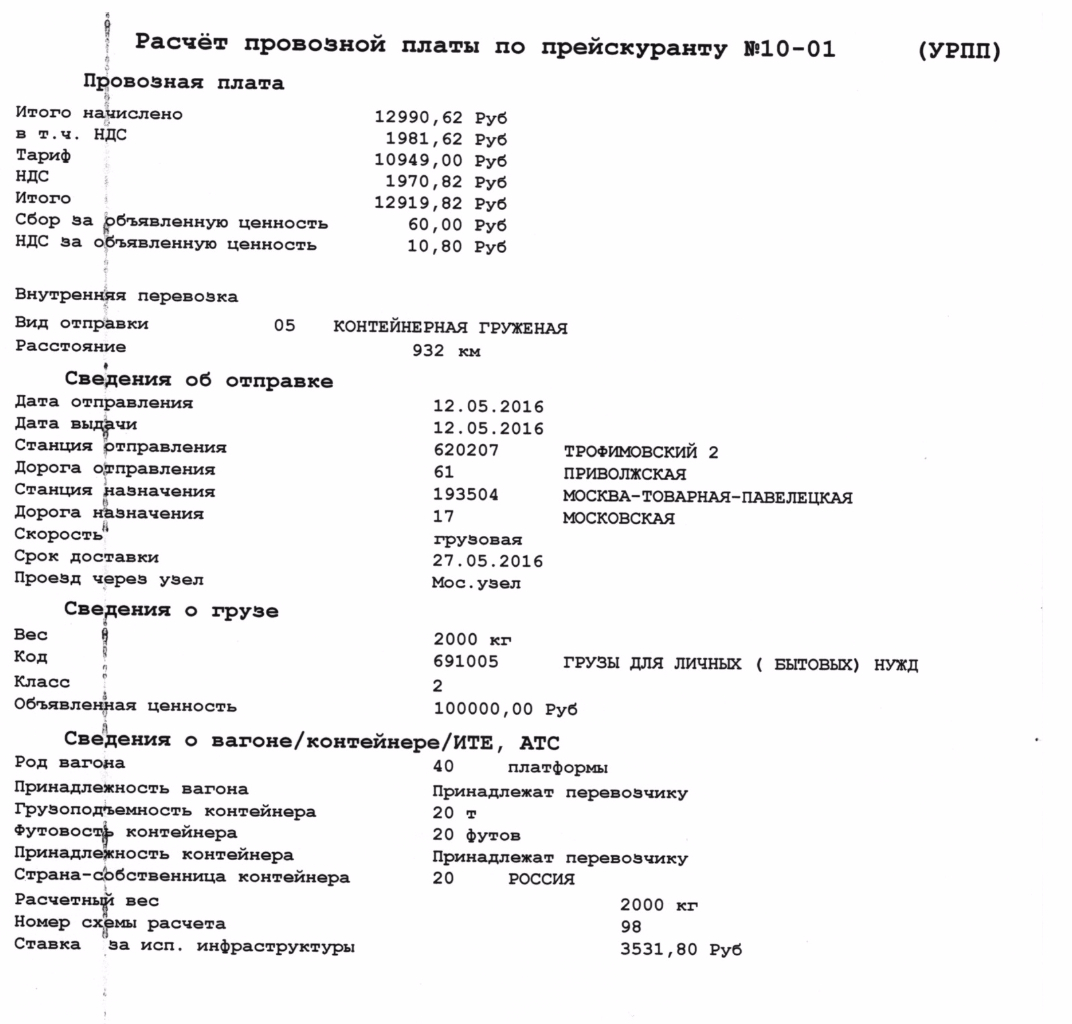 #1043Получил вчера справку из ТрансКонтейнер в Саратове на 20 т. контейнер от Саратова до Москвы, сумма по тарифу перевозки почти 13 т.р. что-то как-то немного, думал что будет больше.