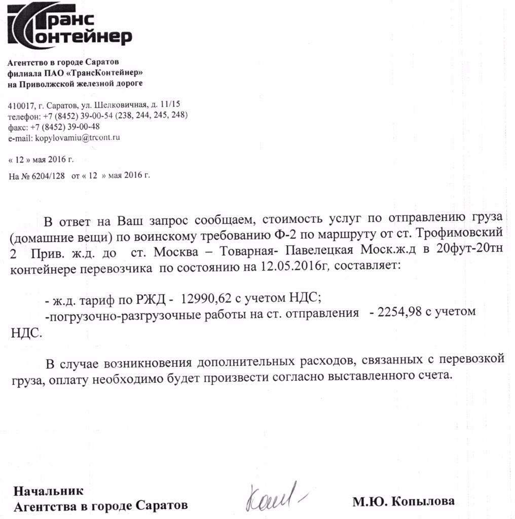 #1034Взяла справку из Трансконтейнера о стоимости перевозки. Что-то не вполне довольна. Сотрудники меня уверяли, что всем в/с выдают именно такие. Однако, когда год-полтора назад общалась по телефону с агентом, она озвучивала сумму порядка 50 тыс., приблизительно. В справку же мне включили лишь убытие. Далее якобы должна насчитывать Мск. Справку о том, что они не работают с контейнерами менее 24 тонн мне тоже отказались выдать, ссылаясь на то, что всем выдают стандартные, как выдали мне.