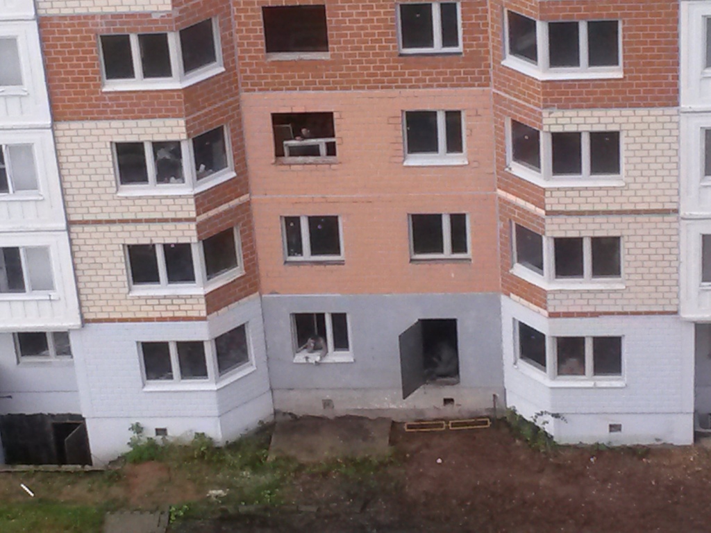 #28474На фото отчетливо видно открытый запасной выход/ вход и счастливых обитателей на разных этажах корпуса!( для охранников, сопровождающих по двое (на троих)- многовато!) Управлять некому!Что-то там, таки, и происходит. Свет днем и ночью горит...По 22 корпусу ни какого движения я лично не заметила, много плит стоят вообще без рам, а дожди идут...