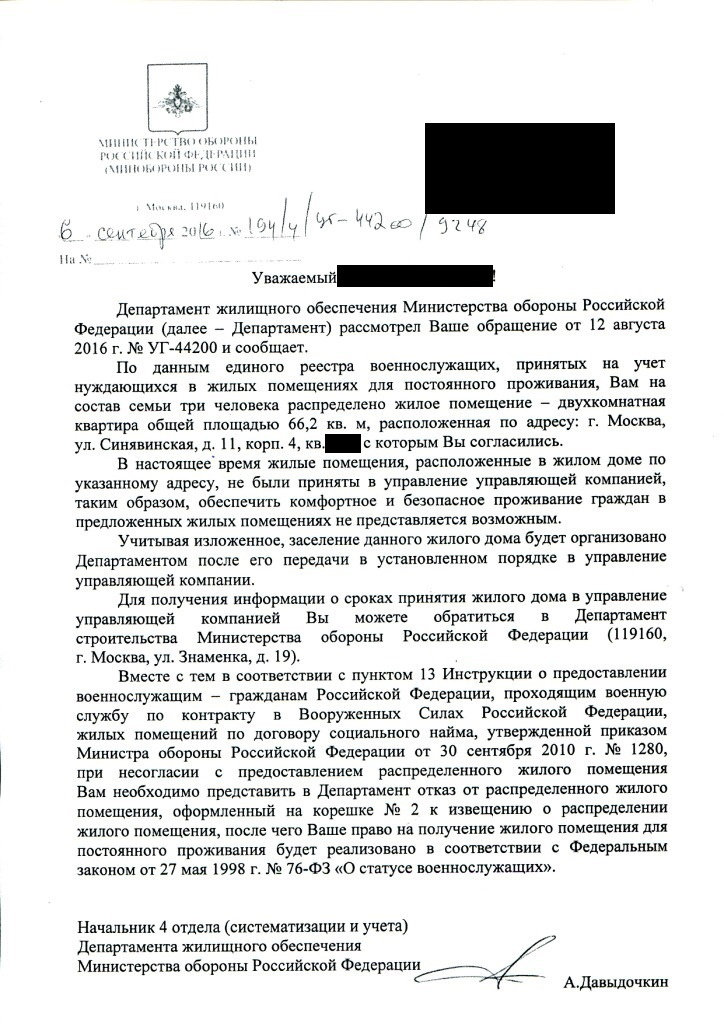 #28271Месяц назад писал через сайт МО РФ обращение по вопросу перераспределения жилья (вместо 4 корпуса любой другой адрес в Москве)...