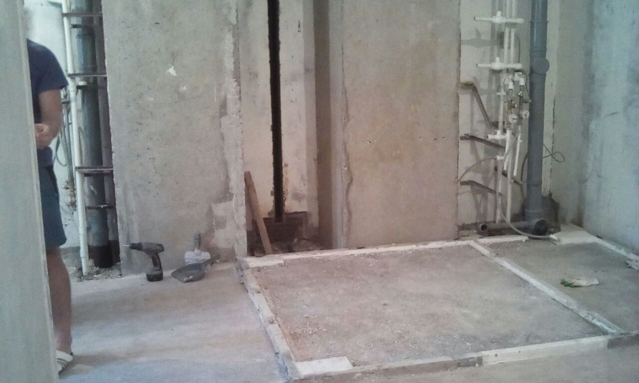 И еще, как бы объяснить...вот где белый бордюрчик идет это бывшая ванная. А где инструменты лежат (дрели и совки) там была стена между кухней и ванной. Так вот, когда онабыла, стена эта, то начиналась она как раз там где инструмент лежит (совки), потом шло пустое пространство, а потом уже монолит который теперь бордюрчик белый.