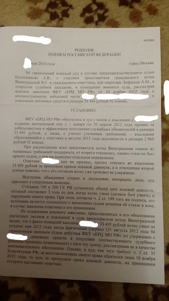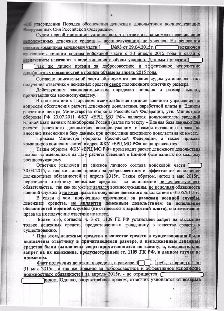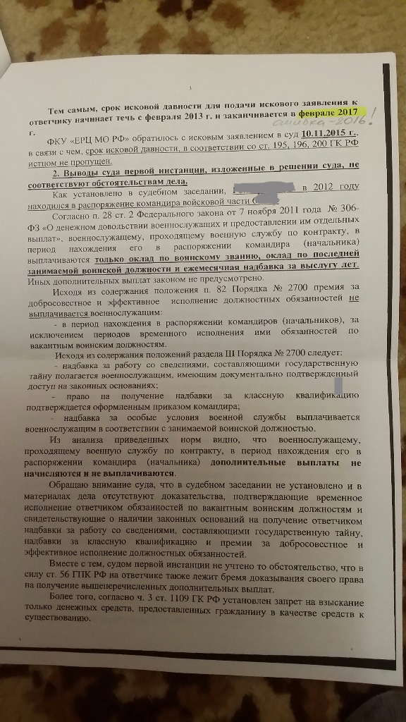 #2713Они не только это могут представить. СКОВС в аппеляции приказы о выплате премий(надбавок)назвал как наличие счетной ошибки.Абсурд! И ,далее, вообще игнорировалось "понятие неосновательное обогащение"!Это позиция до ВС РФ! Потому-что Председатель сам из СКОВС! Поэтому остальные Удержанные суммы обжаловал в Московском гарнизонном военном суде. Туда ЕРЦ не посмело обжаловать!В СКОВСе сумели представить переплату в качестве счетной ошибки.QR_BBPOST А то ЕРЦ подало на меня иск по переплате и в иске пишет о положительной практике(в пользу ЕРЦ).
