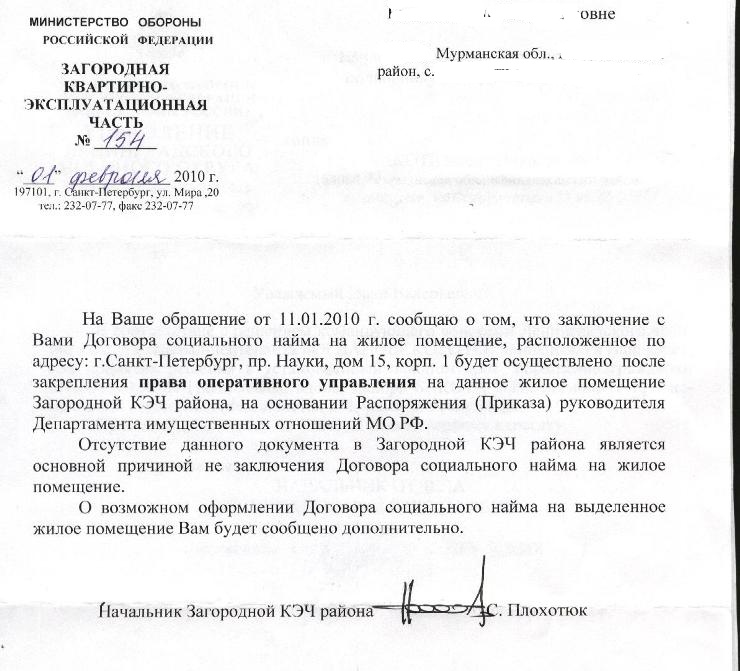 У нас тоже округ заключил Предварительные договора найма с таким содержанием, где военнослужащие имеют кучу обязанностей , а они одни права. Ну и еще в противоречие ст. 153 ЖК (Обязанность по внесению платы за жилое помещение и коммунальные услуги возникает у:1) нанимателя жилого помещения по договору социального найма с момента заключения такого договора;) уже сейчас обязывают народ платить комуналку. Везде один и тот же беспредел.В этом договоре вообще нет ни одного обязательства наймодателя, то есть КЭЧ, только обязательства жильцов.