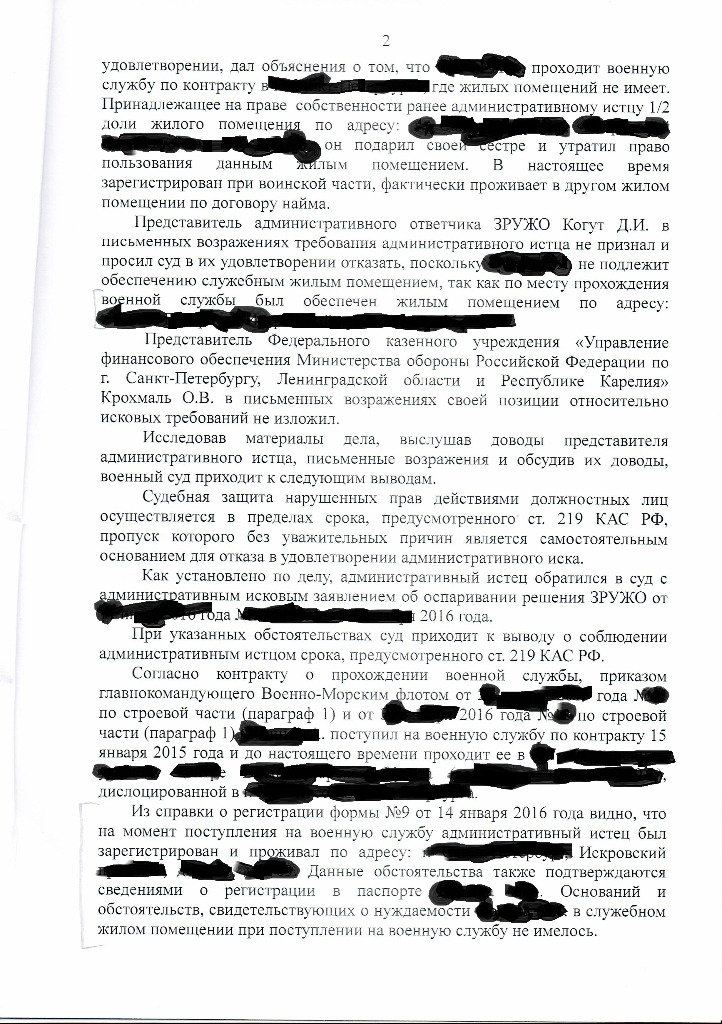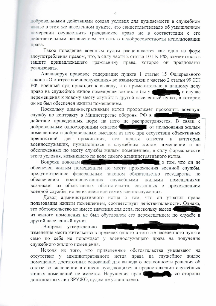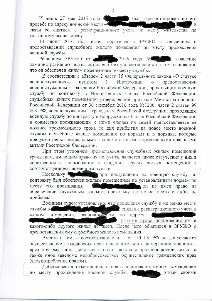 #619Здравствуйте! Скажите пожалуйста, мне отказали в иске о признании нуждающимся в служебном жилом помещении. Я, военнослужащий-контрактник. Отказали на основании того, что я специально ухудшил свои условия. Только вот смотрите, у меня была 1/2 доля в квартире, я ее подарил своей сестре в конце 2014 года, спустя 3 месяца в 2015 году я поступил на службу, т.е. я подарил квартиру до того как пошел на службу, но выписался с этой квартиры спустя 4 месяца с момента поступления на службу. Судья отказал, так как посчитал, что на момент прохождения службы я там проживал и что я намеренно ухудшил свои условия снявшись с регистрационного учета, но я там не проживал, а снимал квартиру (хотя квартира уже не моя, а моей сестры) и снялся я с регистрационного учета по причине того, что квартира не моя и сестра ее продала, а новый собственник попросил всех сняться с регистрации.