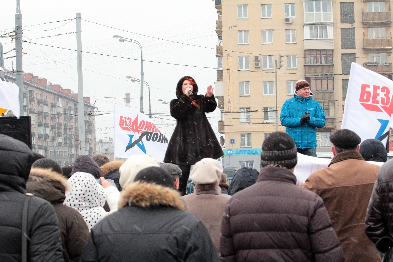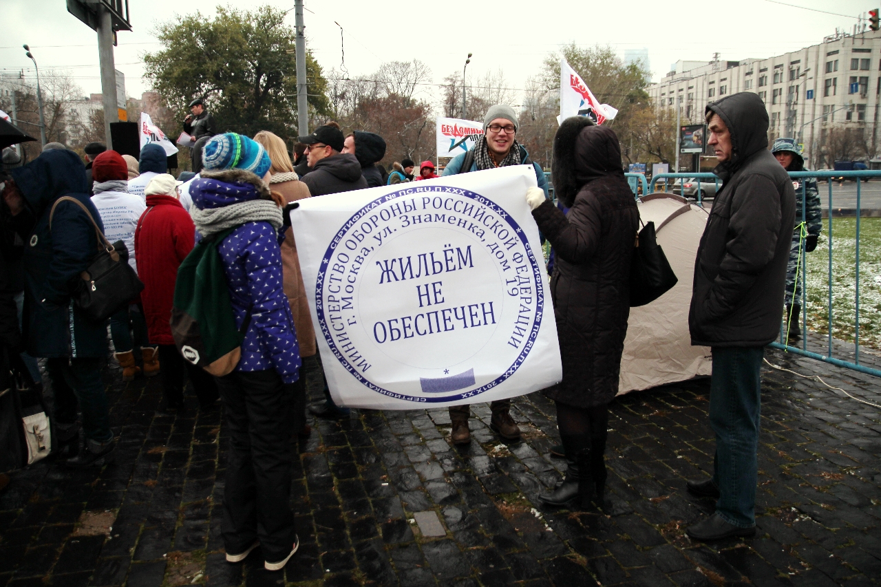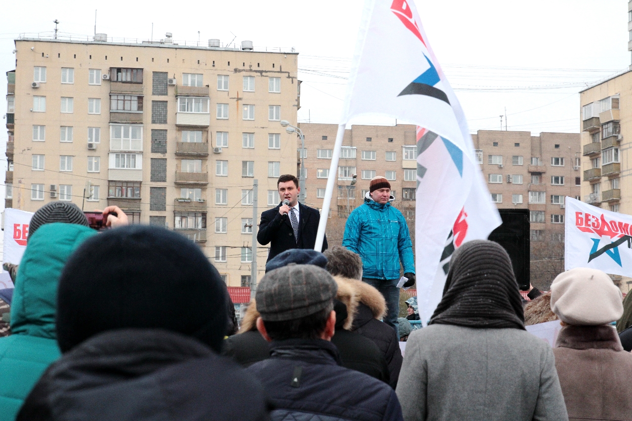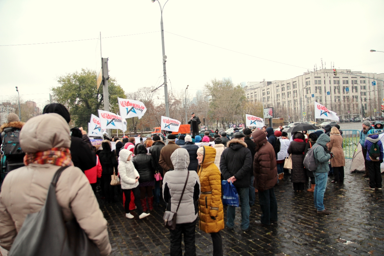 " Надо сказать, что самопровозглашенные «бомжи» выглядят довольно прилично. Среди участников митинга особенно выделялась женщина, одетая в норковую шубу. Жителя столицы норковой шубой не удивишь, но всё же странно видеть её на человеке, который считает себя «бездомным»