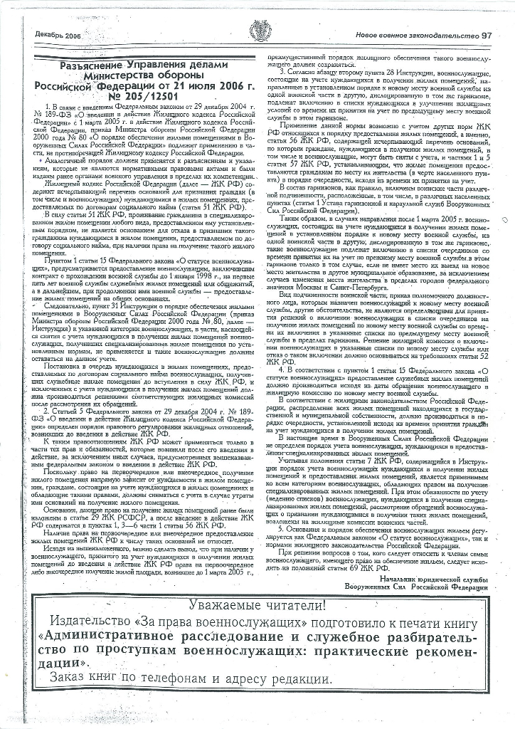 Обзорная справка о рассмотрении военными судами гражданских дел, связанных с жилищным обеспечением военнослужащих, граждан, уволенных с военной службы, и членов их семей
