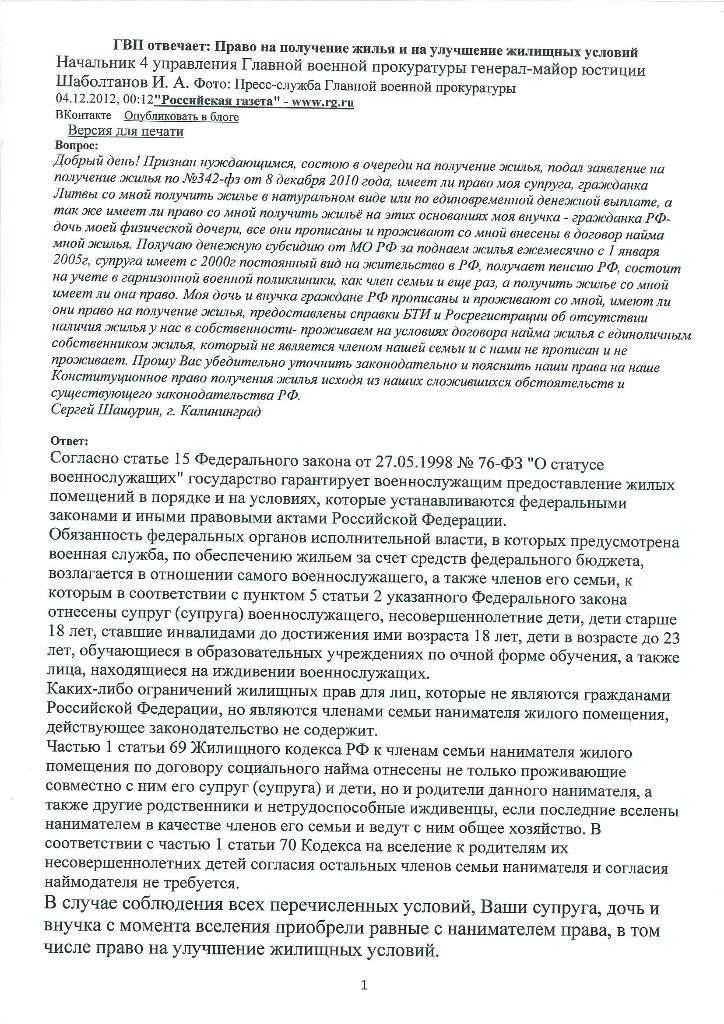 #313Cмотрим пост 303 от 15 11 2016 г этой ветки, в прикреплённых файлах излагают ответ не фантазёры, а должностные лица Главной военной прокуратуры МО РФ, которая входит в состав Генеральной Прокуратуры РФ, а прокуратуры МВД, МЧС, ФСИН, Росгвардии, и тд тоже в составе ГП РФ их мнение будет таким же. Кроме того все НПА РФ проходят процедуру рассмотрения на предмет коррупции и тд через ГП РФ.....По семье из Белоруссии отец уволен, признан в НУЖУ, проживал в РФ, гражданин РФ, его не стало- супруга с детьми граждане этой страны жили в Белоруссии ст 69 ст 31 ЖК РФ нет совместного проживания-не могут являться членами семьи по факту совместного получения жилья и п 5 ст 49 ЖК РФ иностранные граждане, а не иностранные граждане члены семьи гражданина РФ - гражданство РФ касается и соотноситься только к ответственному квартиросъёмщику или собственнику .....Перестаньте фантазировать. КС чётко указал что не положено и отказался рассматривать! Ранее было решение(по-моему 2005 г. члены семьи-граждане Белоруссии)в котором также был отказ. Где Вы нашли здесь уголовное дело? Причём здесь СКР? Вы хоть в одном судебном заседании участвовали? А почему Вы думаете не приняли до сих пор поправку по наследству? Да потому, что сумма на жилье будет исчисляться триллионами.