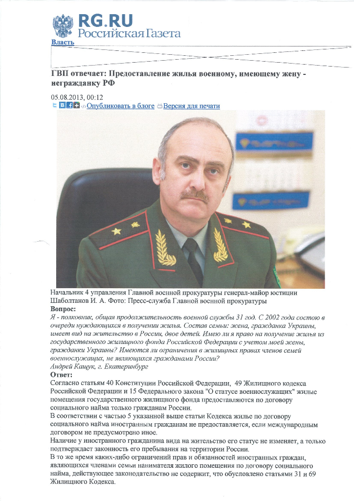 #305Прошу Вас укажите номер решения КС РФ или прикрепите всем будет ясней.Это напечатано в правительственной газете Российская газета электронная версия и в журнале Право в вооружённых силах.Да, что Вы. Раньше было решение КС, в котором чётко указывался запрет в получении жилья иностранным гражданам-членам семьи военнослужащего. А разве сейчас что-то поменялось? В "Мурзилках" можно писать что угодно, а вот в суде будет всё по другому.После таких документов не надо добиваться гражданства...