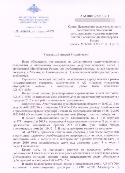 Сразу объясню где наши с Вами интересы совпадают с интересами дольщиков. Наши интересы совпадают в требованиях к Правительству РФ. У нас есть абсолютно достоверная информация о том, что МО РФ обратилось в Правительство РФ с просьбой включить в список объектов СУ-155, подпадающих под санацию. Правительство РФ МО РФ в этом отказало, деньги на достройку не выделяют. Одновременно у нас появилась информация о том что первыми лицами Правительства РФ были приняты решения на перевод последних денег на счета СУ-155 по объектам МО РФ. Сумма около 8 млр.руб. На момент перевода денег СУ-155 уже не строил наши дома и у этой компании были огромные задолженности. Но это абсолютно не остановило перевод денег. Нам хорошо известно, что именно такую сумму указывало ГУОВ как необходимую для достройки. Таким образом мы можем констатировать факт, что чиновники Правительства РФ имеют непосредственное отношение к нашей проблеме как и к проблеме дольщиков СУ-155. Выплачивать деньги банкроту они могут, а включить объекты МО РФ в список санируемых не могут. При это при всем мы не снимаем ответственности с МО РФ за ситуацию с нашими домами.