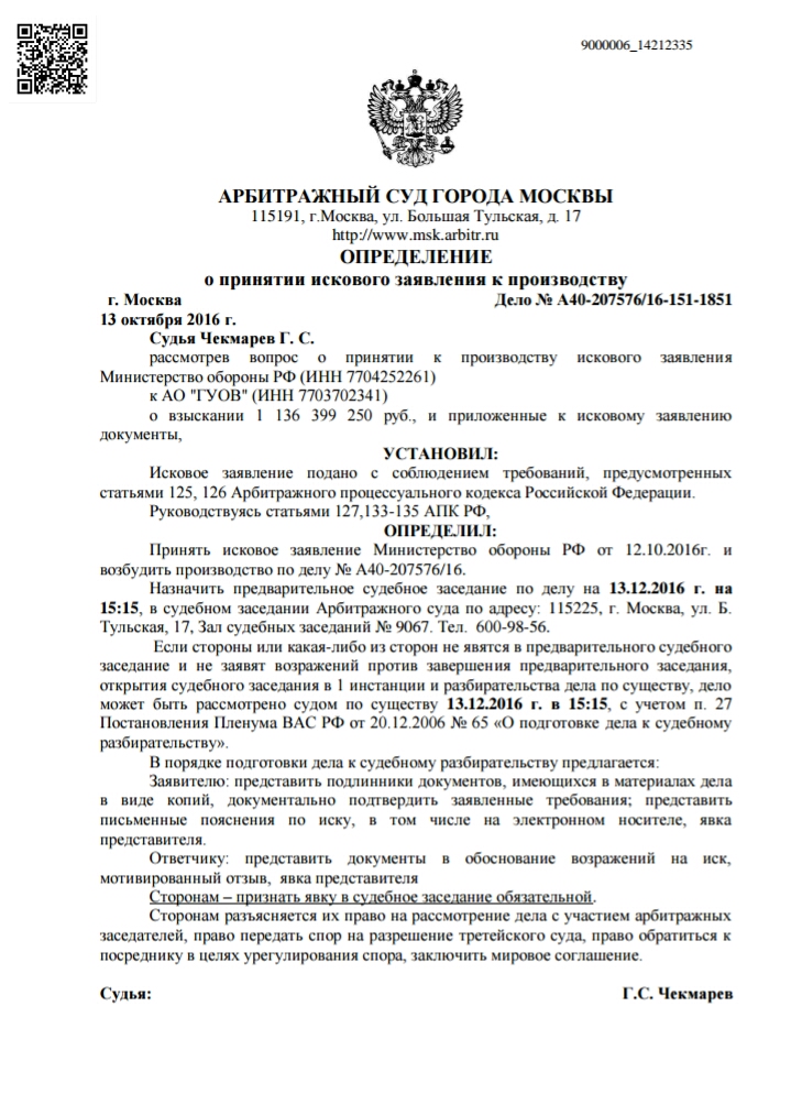 Из материалов дела № А40-207576/2016 следует, что исковое заявление было подано в суд 12 октября. Тогда же АСГМ зарегистрировал второй иск Минобороны к ГУОВ – на 46 млн руб. (дело № А40-207580/2016). Кроме того, в конце ноября Минобороны подало к ГУОВ еще один иск на 2,5 млрд руб. (дело № А40-238365/2016). Подробности исковых требований не раскрываются.