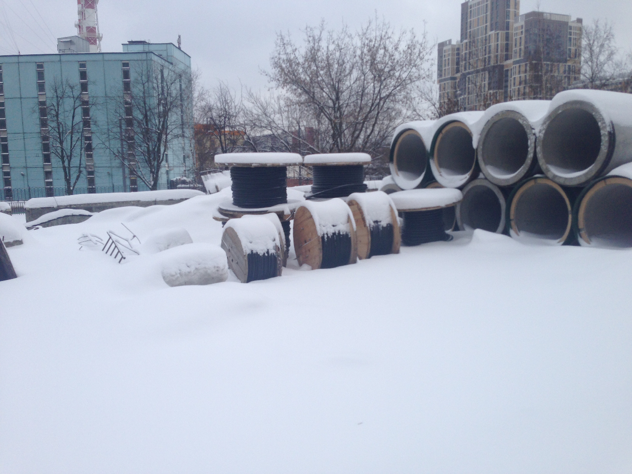 3. Возле 15 корпуса сваливают стройматериалы (цемент), потому что дальше машина сейчас проехать не может и от туда рабочие тащат на санках в 9-й корпус. В 9 корпус подано ОТОПЛЕНИЕ (за чей счет?)