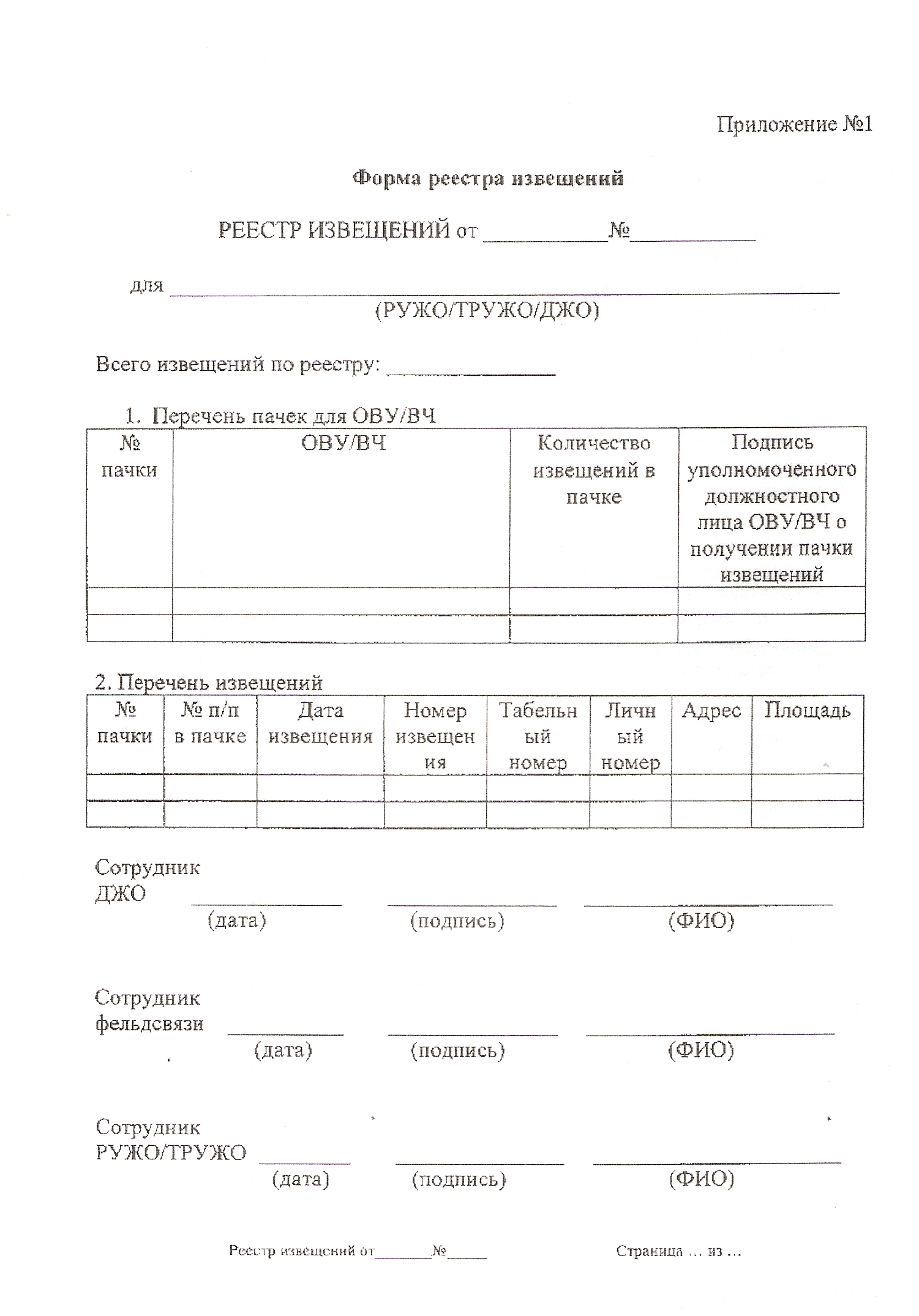 1) согласие с предоставлением распределенного жилого помещения, оформленное в корешке № 1 к извещению о распределении жилого помещения по рекомендуемому образцу согласно приложению № 6 к Инструкции;