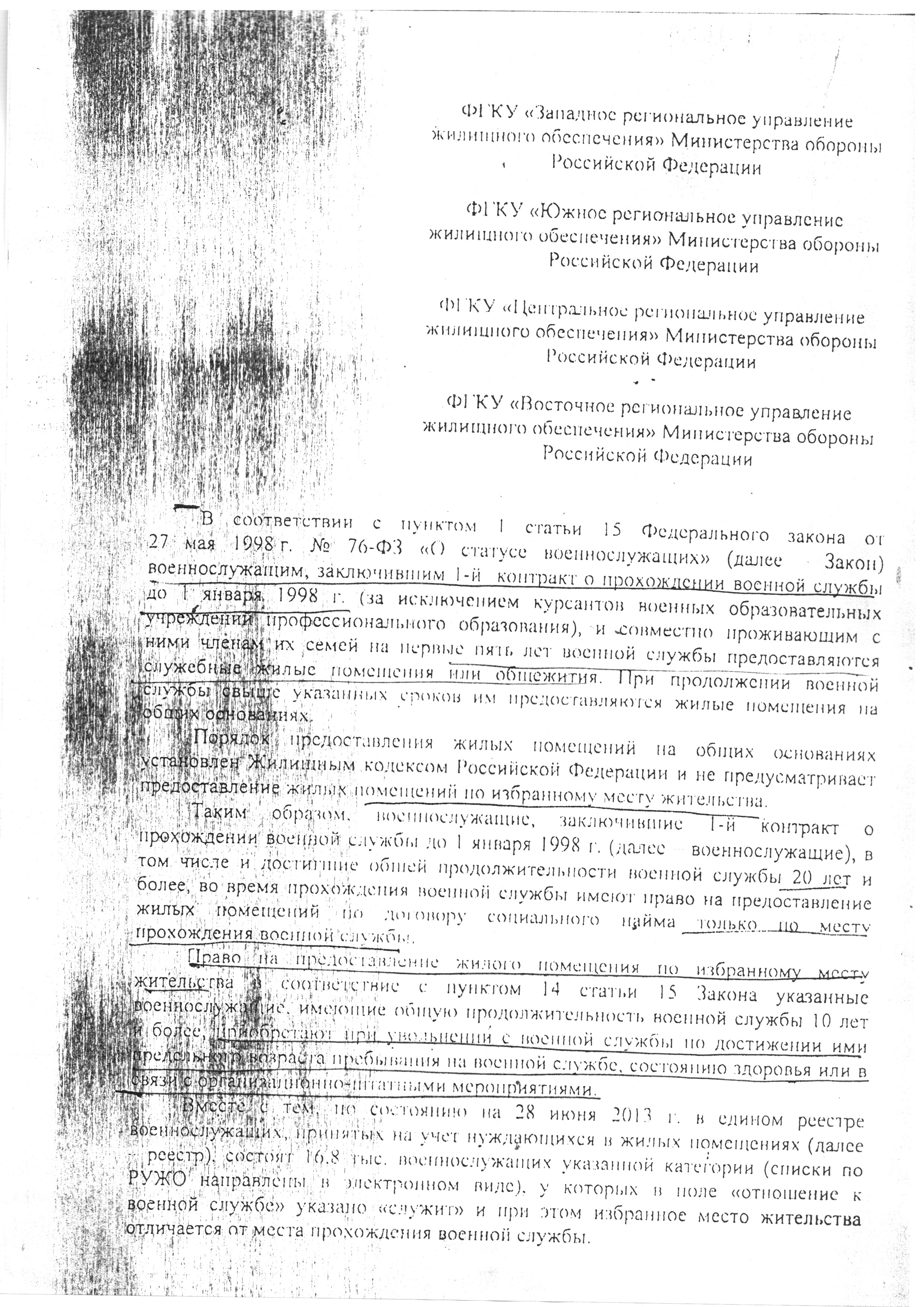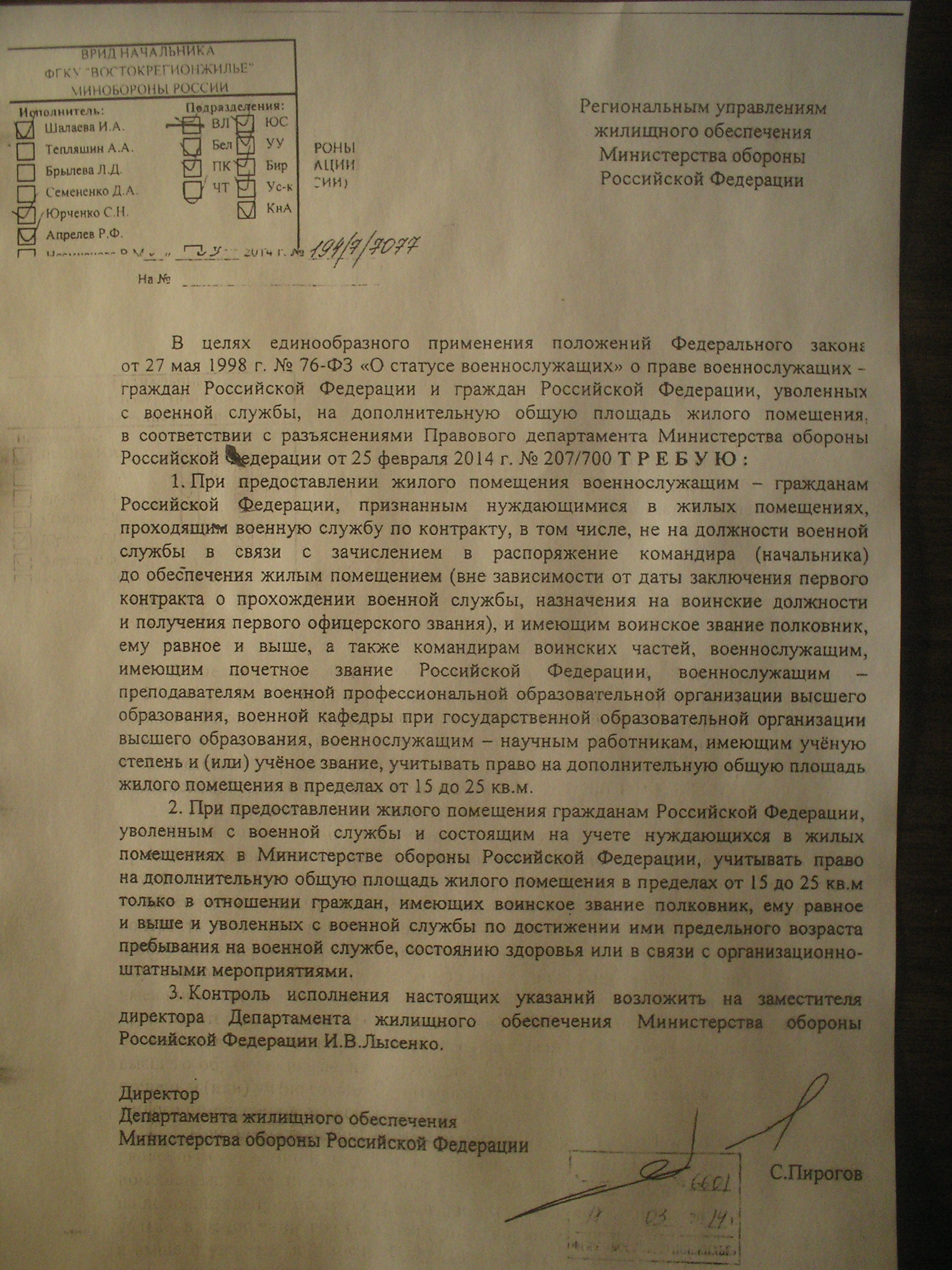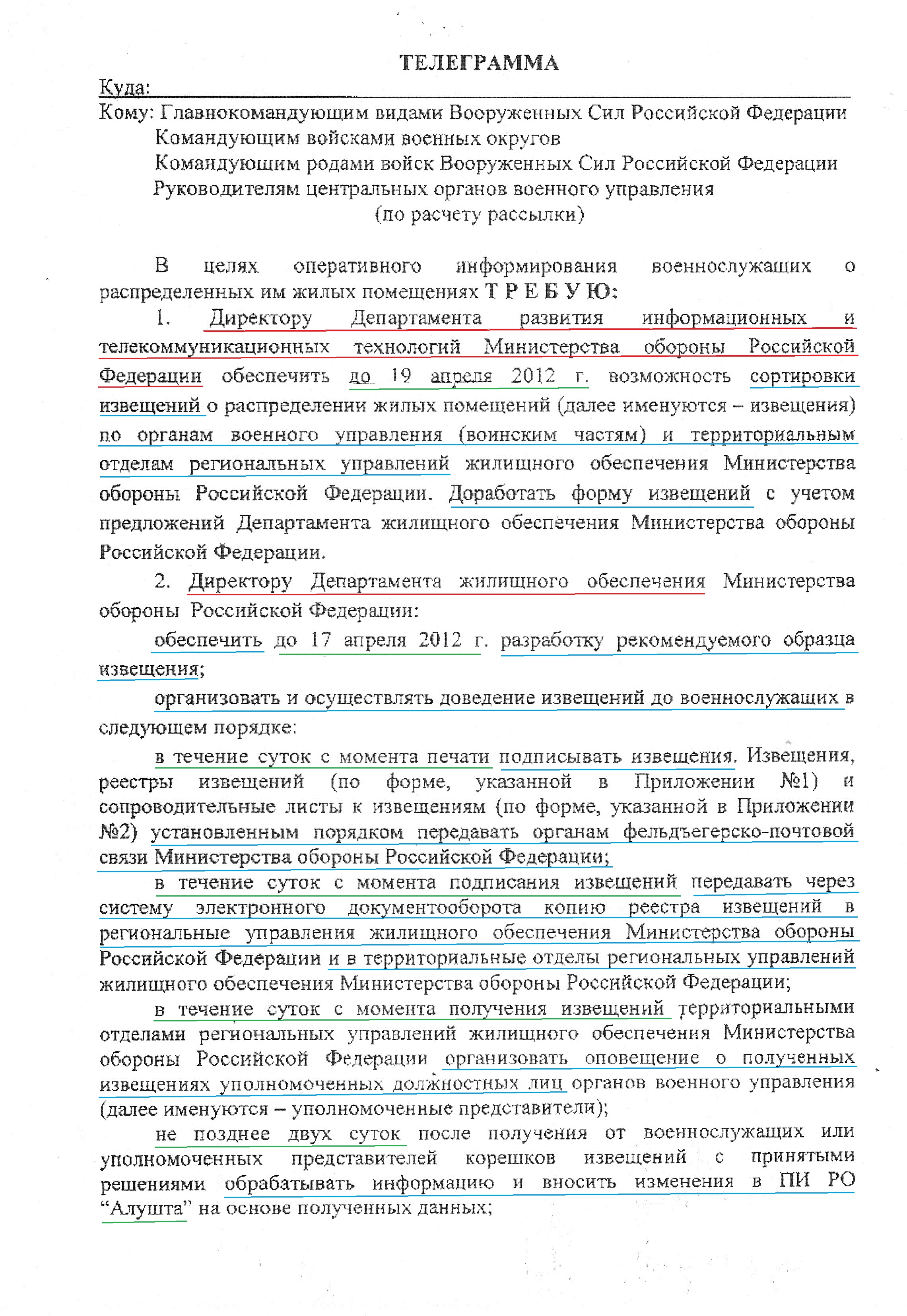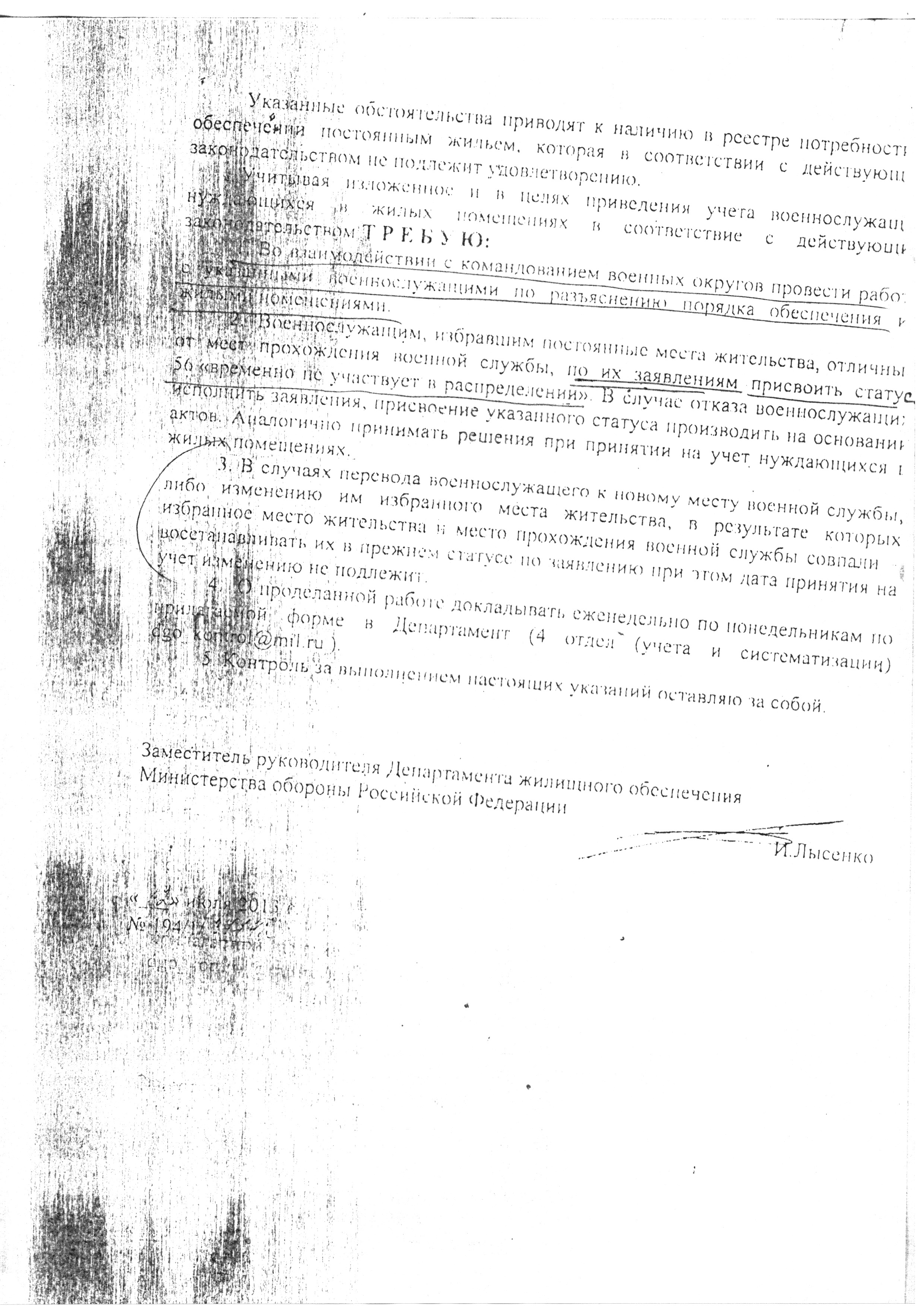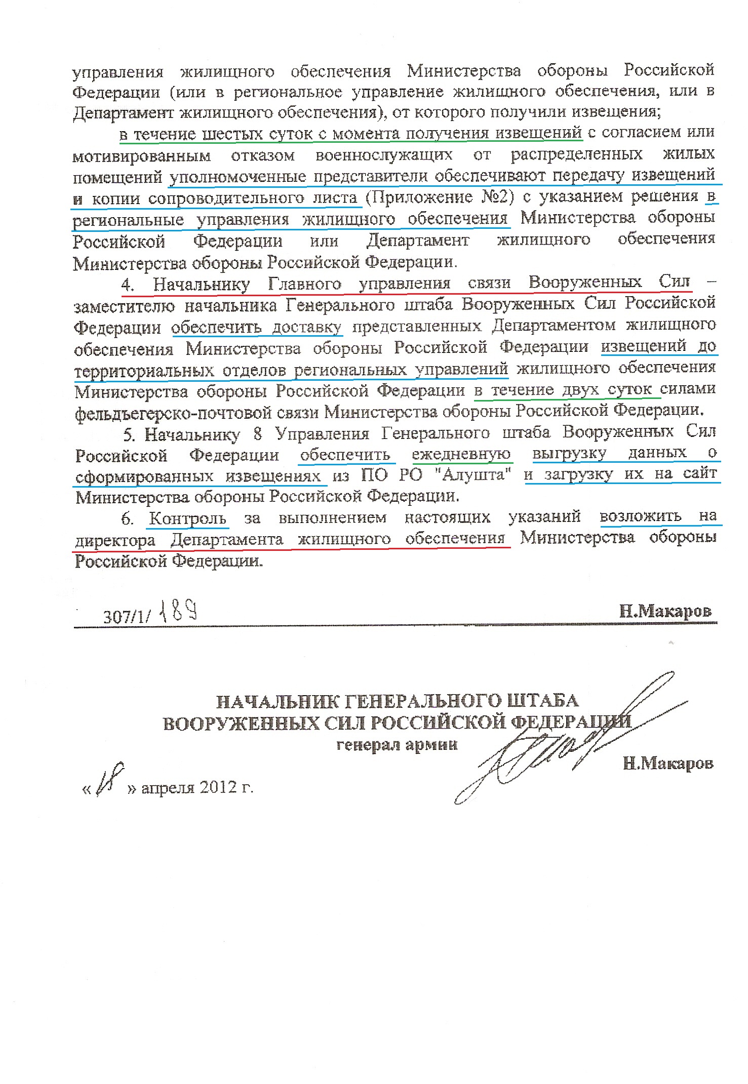 В случае запроса должностными лицами Департамента жилищного обеспечения Министерства обороны Российской Федерации и региональных управлений жилищного обеспечения Министерства обороны Российской Федерации дополнительных документов, не предусмотренных указанными пунктами Инструкции, просьба сообщать по телефону горячей линии 8-800-200-22-94.