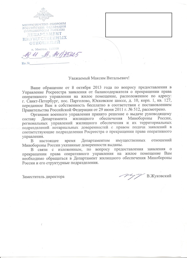 Ответ из ДЖО МО РФ о снятии оперативного управления