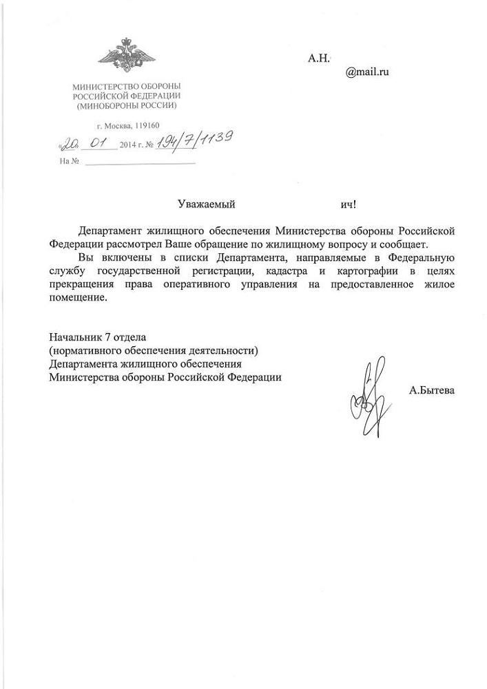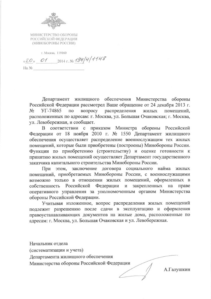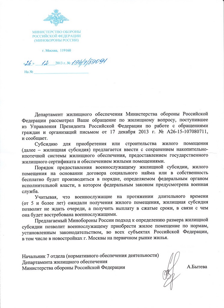 На запрос ОР в Минобороны по жилищному обеспечению военнослужащих, ответил директор ДЖО МО РФ Пирогов С.В.